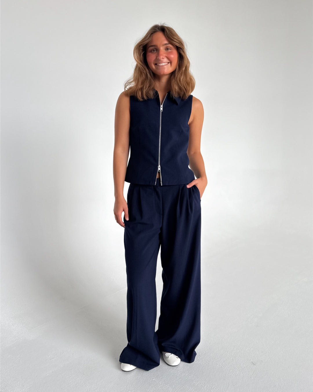 Modelfoto af pige som bærer Kate bukser i Navy, samt Kate top og hvide Alma ballerinaer. Alt fra By Sofie Sønderby