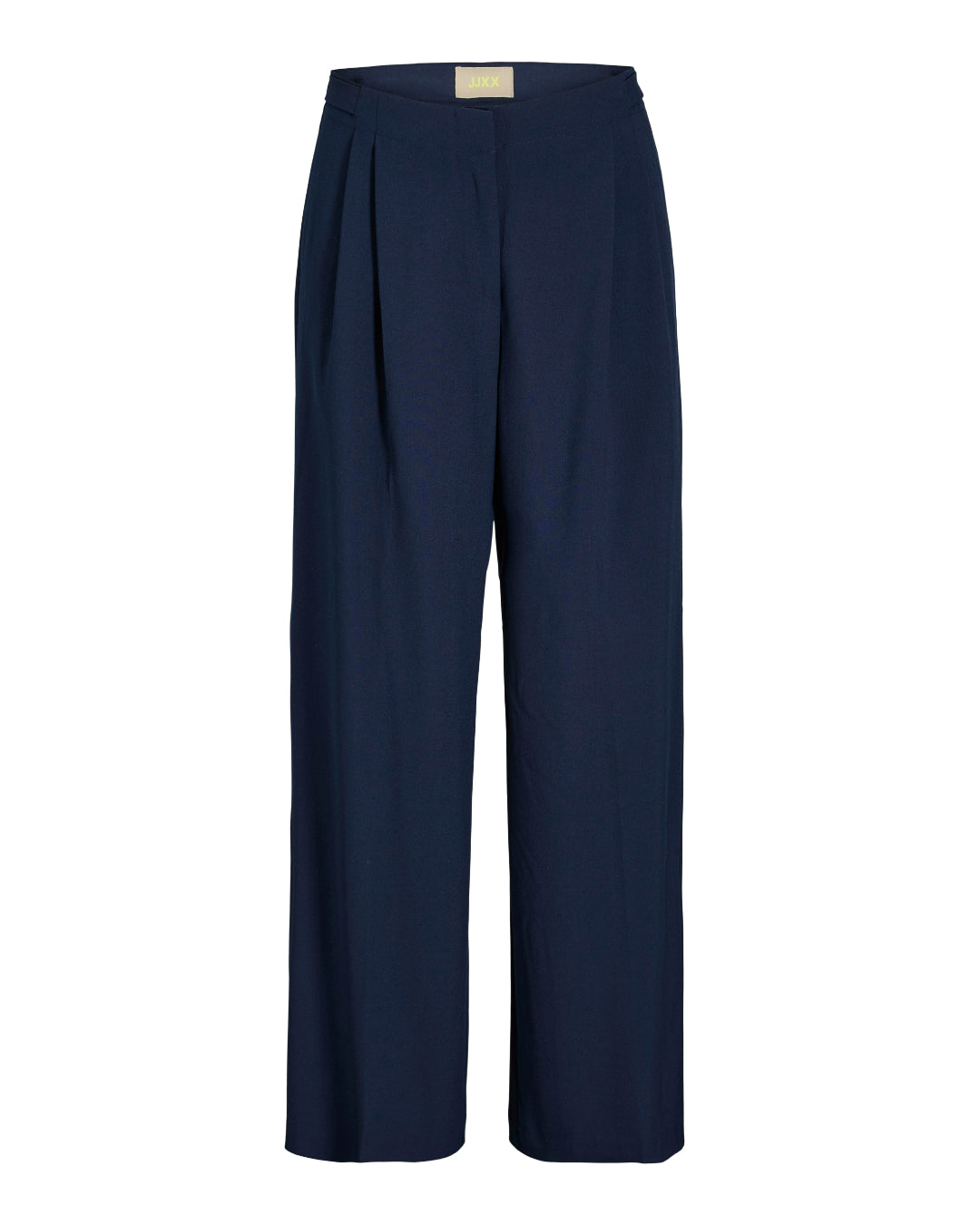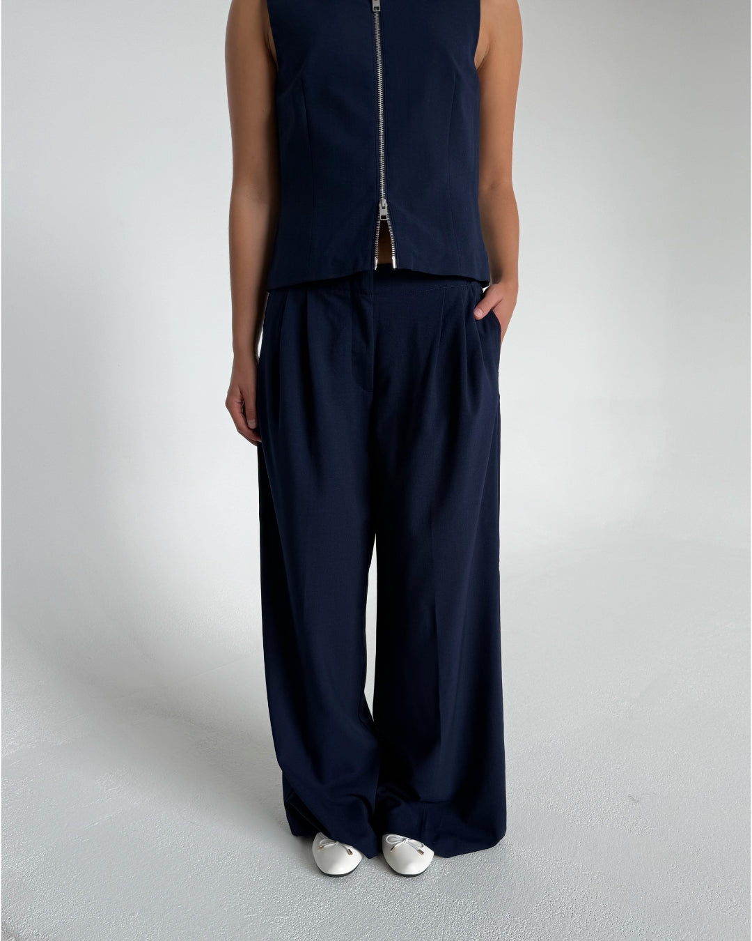 De fina KATE byxorna, navy är ett par basic wide leg byxor som sitter super fint på kroppen. Byxorna är mid waist och lätta i tyget och har möjlighet till insnävning i midjan.