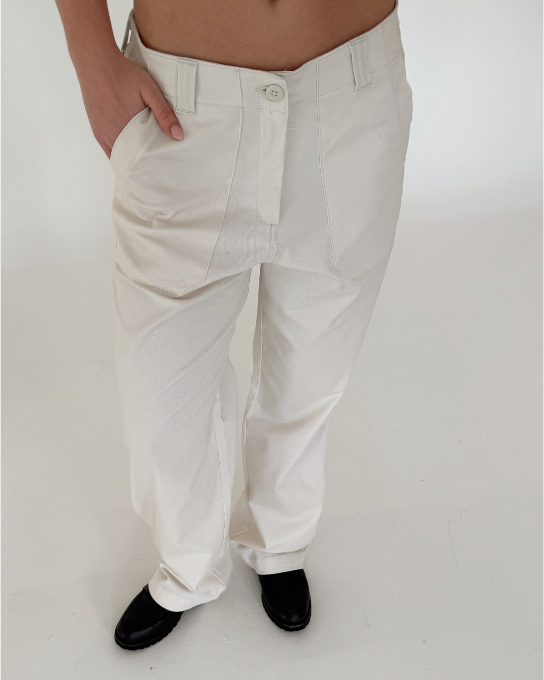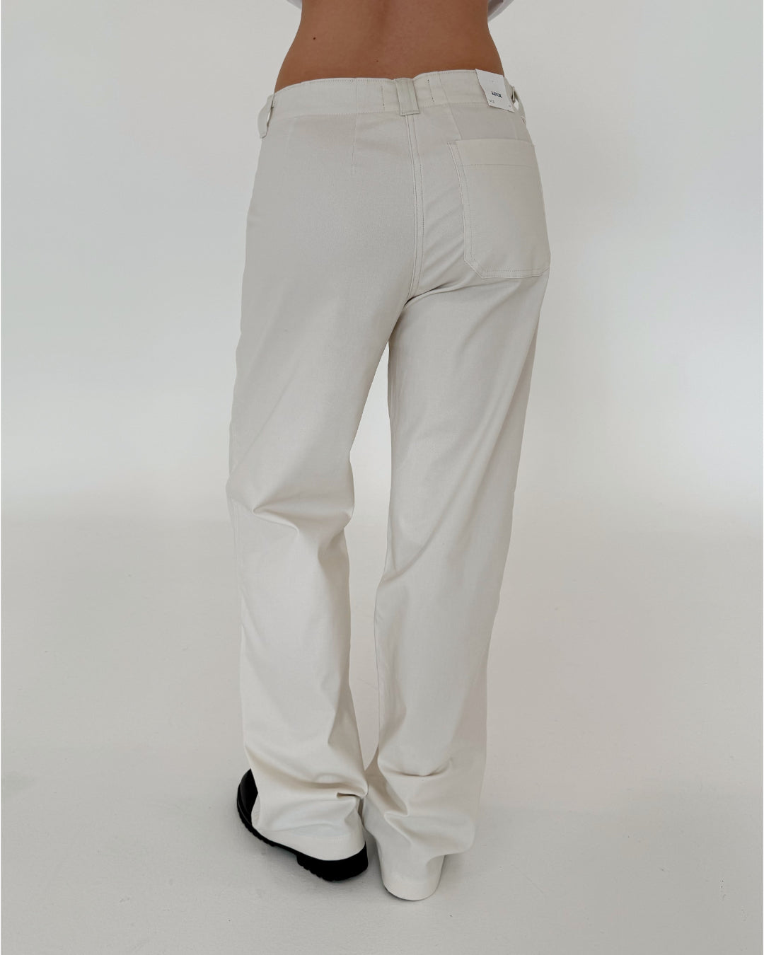 Bukser, iført af en person, er lyse og vide, parret med sorte sko. Baggrunden er enkel og hvid, hvilket fremhæver det minimalistiske look.