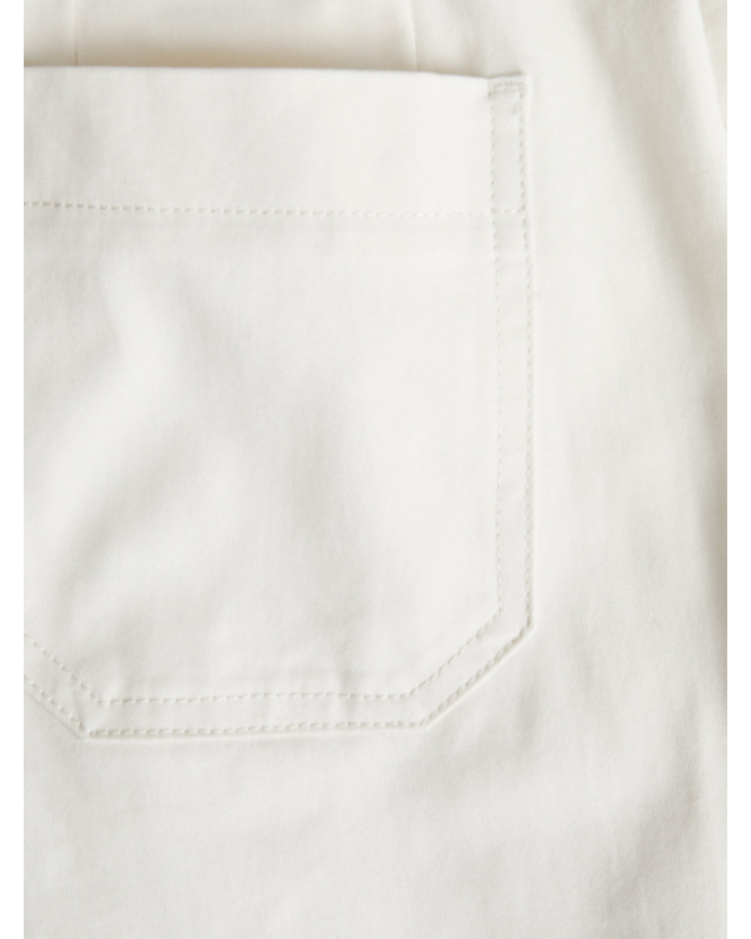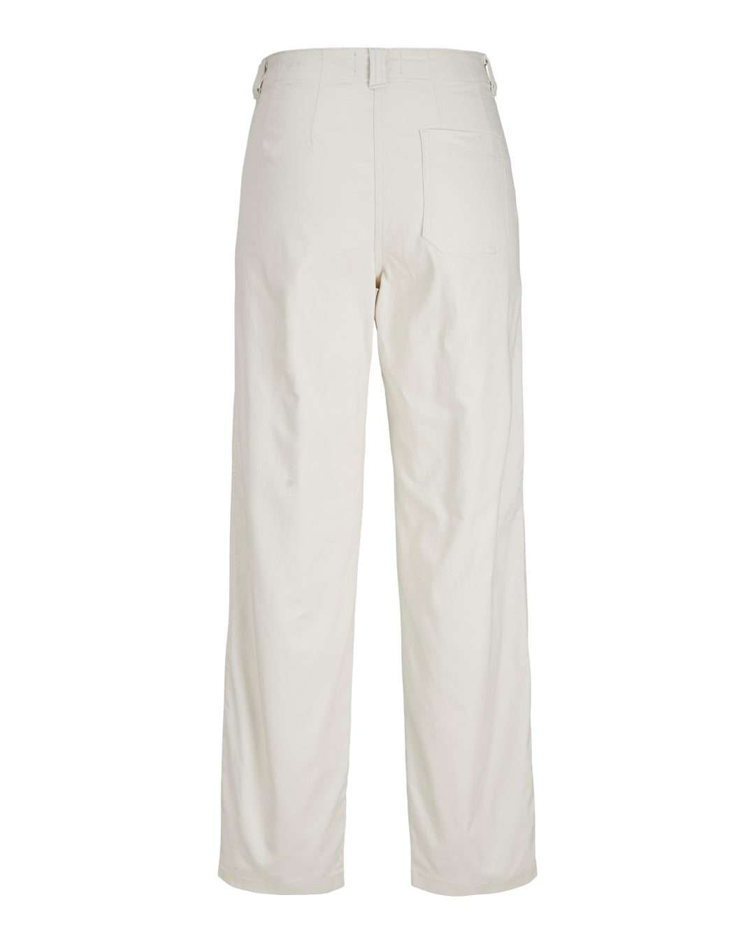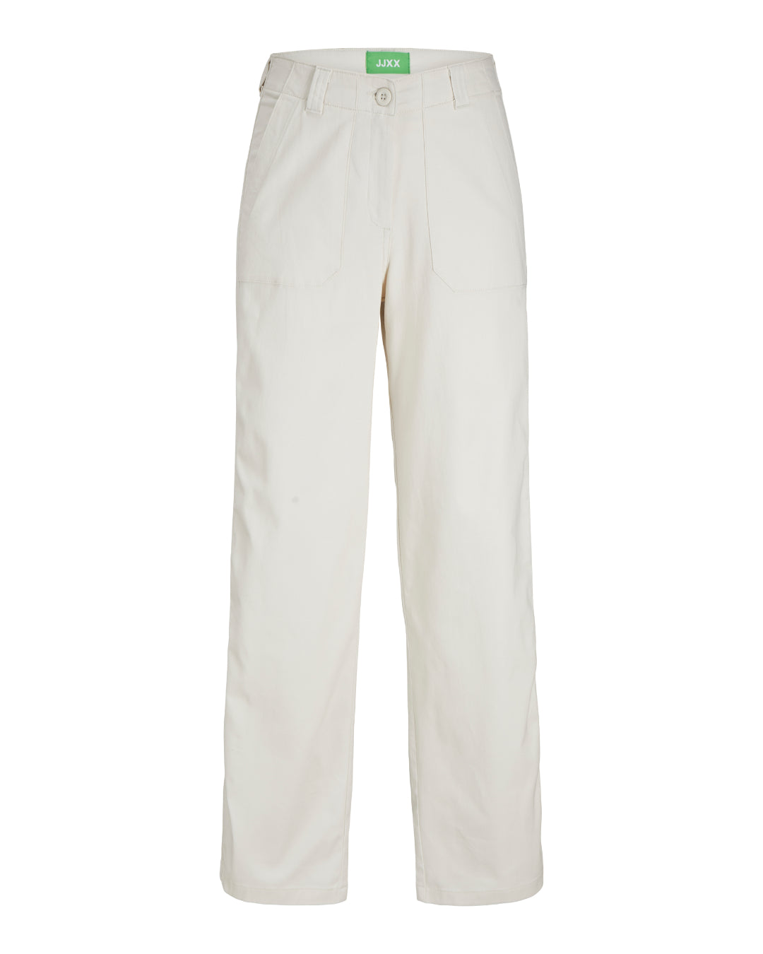 Bukserne er hvide med en høj talje og lommer foran. De er stillet i en neutral baggrund. Et grønt mærke med teksten "JJXX".