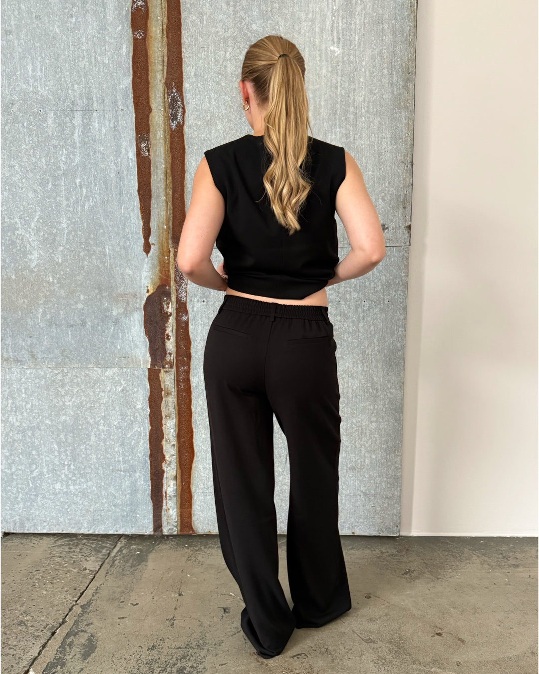 Modelfoto af pige der bærer Lisa bukser i sort, samt sort Lisa vest. Alt fra BySofieSønderby