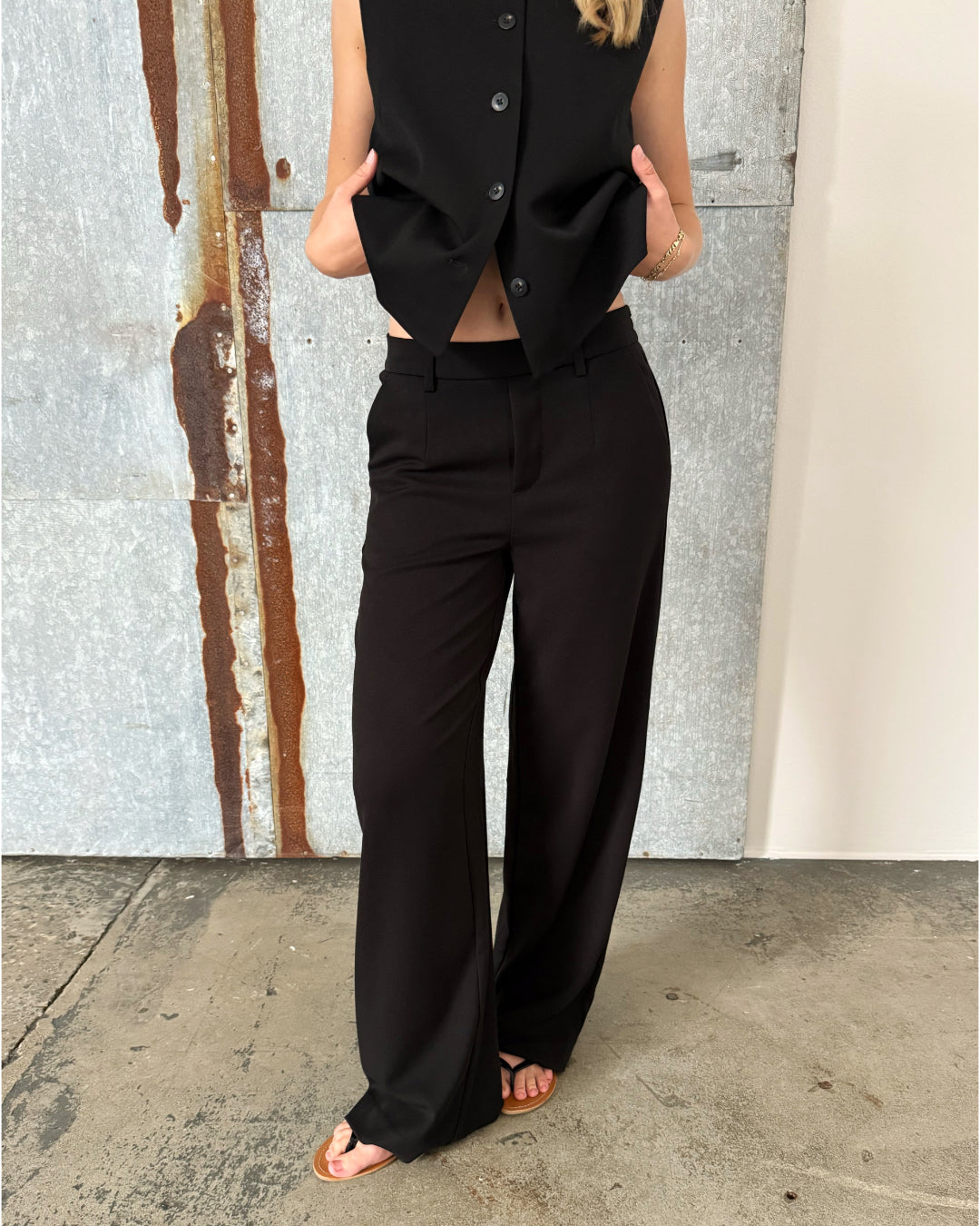 De fina LISA byxorna, svart är ett par basic wide leg byxor, som sitter super fint på kroppen. Byxorna är mid waist och lätta i tyget och passar flera bredder då det finns elastik bakpå i midjan.