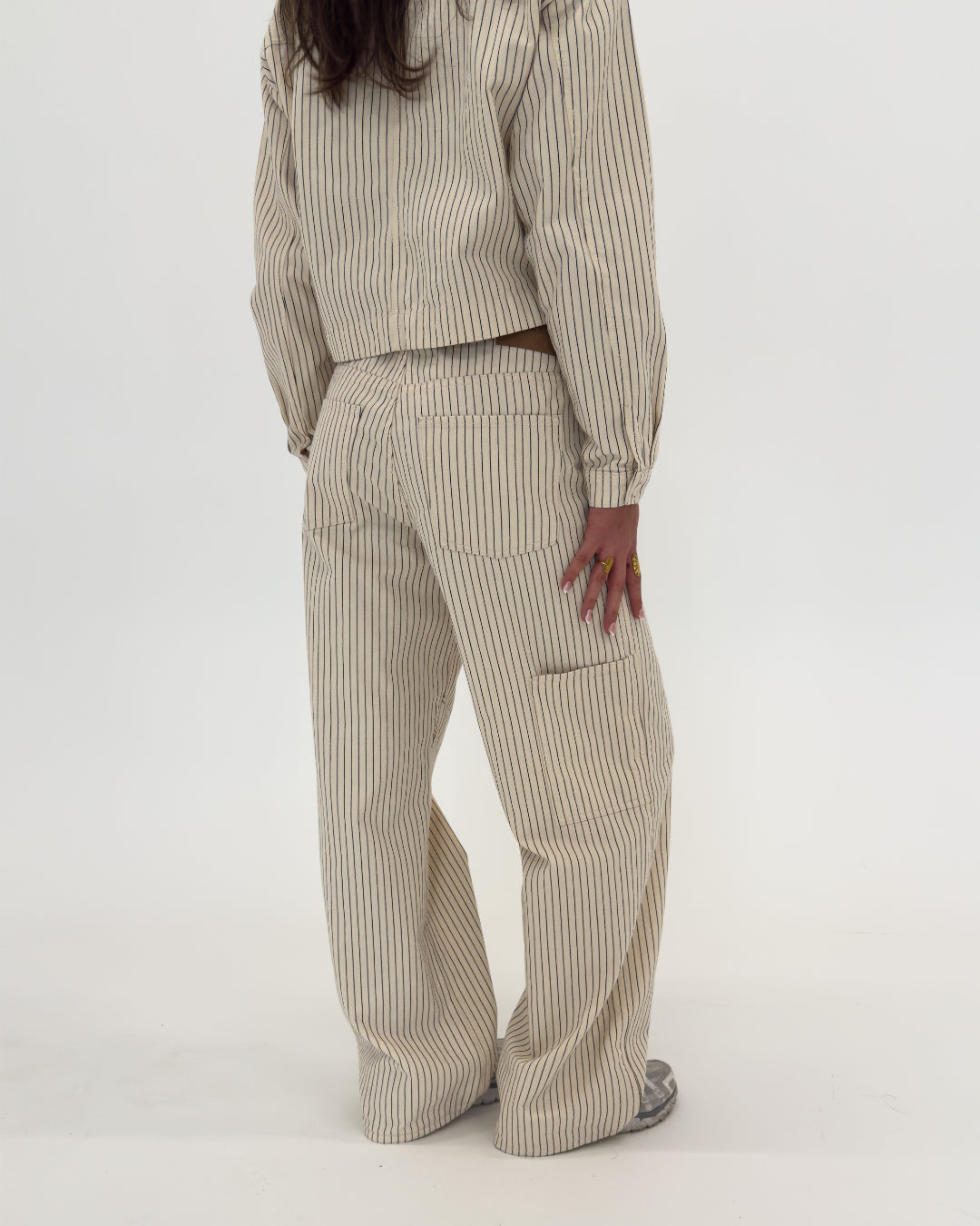 En person iført en beigefarvet, stribet jakke og bukser står med ryggen til. Personen står på en lys baggrund, og en hånd er synlig med en gul ring.