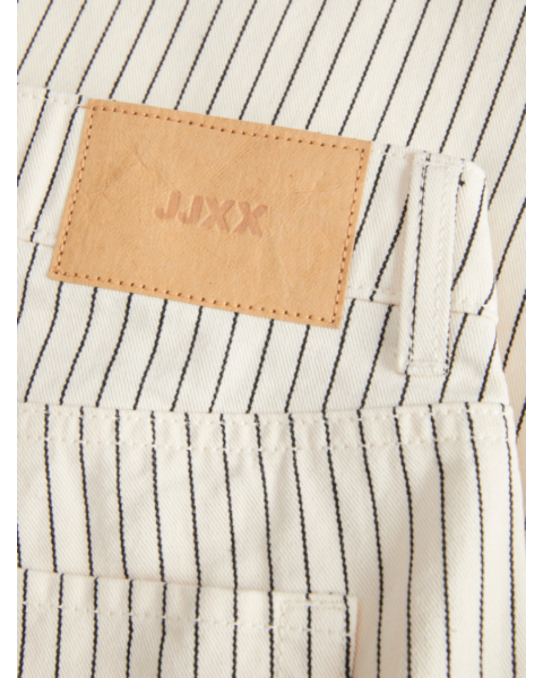 Bukselomme med sorte striber og brun lædermærke med teksten "JJXX", i et stilfuldt og moderne design.