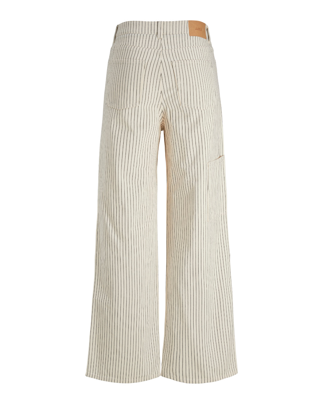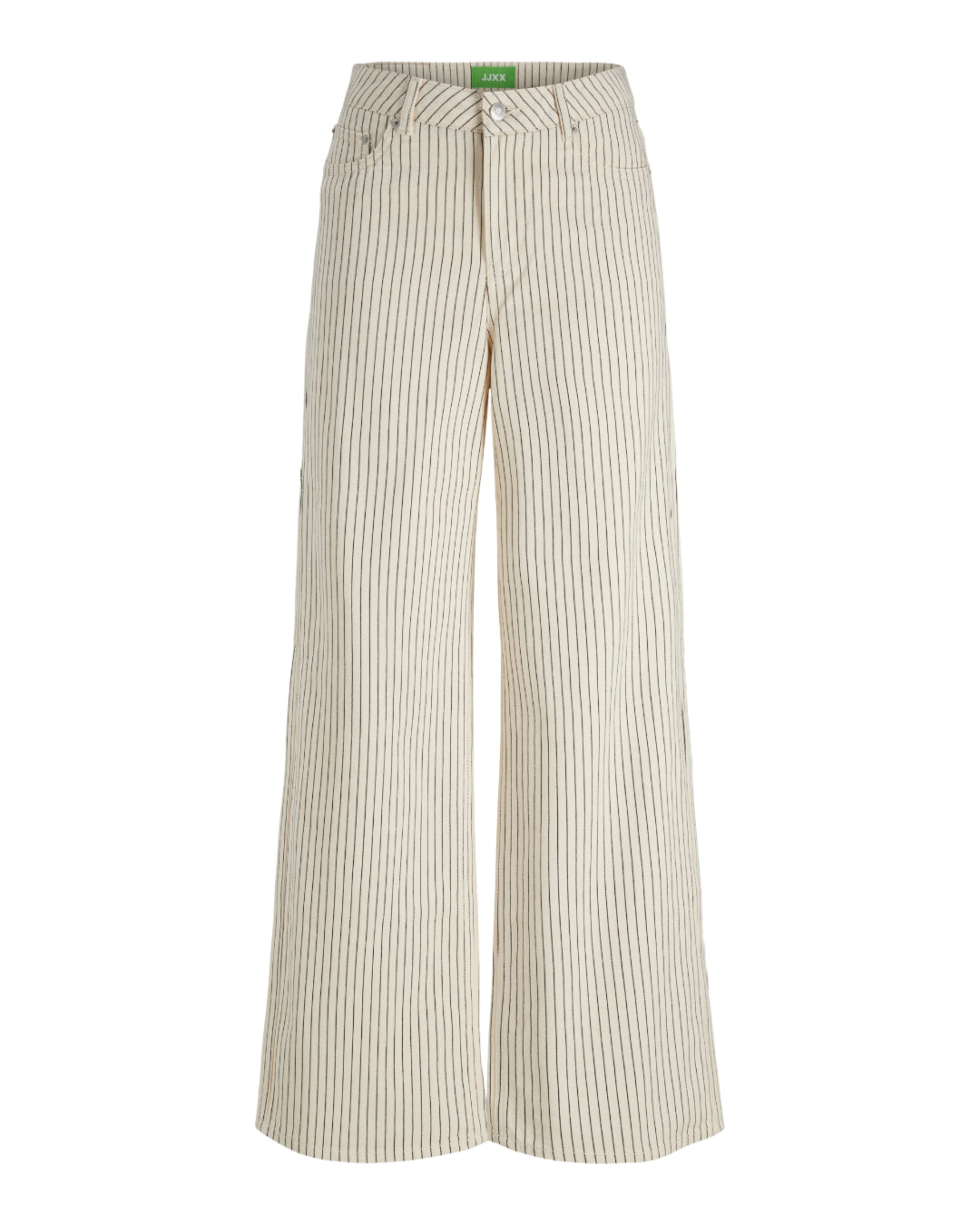 Beige, stribede bukser med brede ben står opret. Mærket "JJXX" er synligt i grønt på linningen. Bukserne har en knaplukning og er præsenteret mod en hvid baggrund.