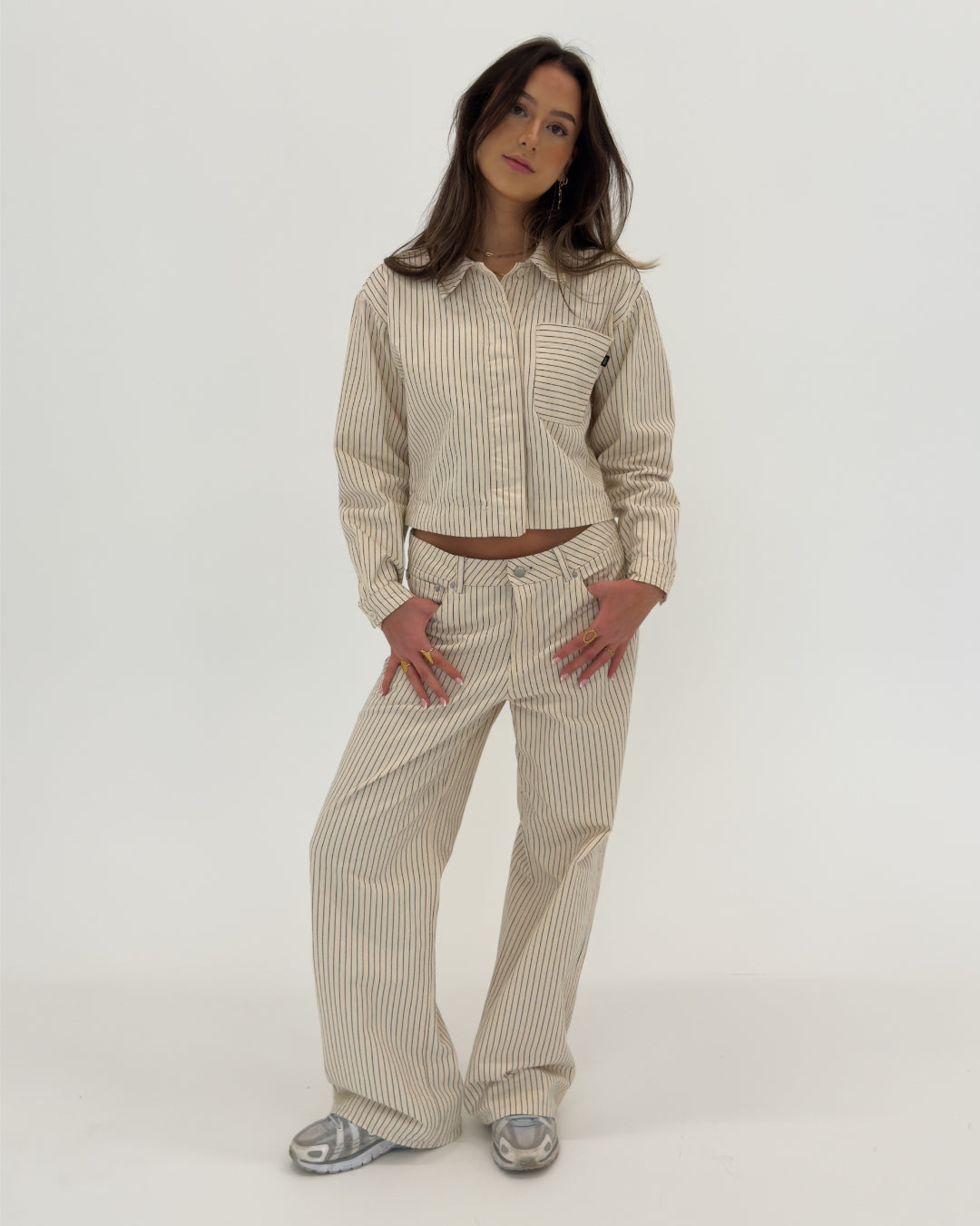Person iført en beige, stribet todelt dragt med lange ærmer og bukser, står afslappet med hænder i lommerne. Baggrunden er en enkel, hvid væg.