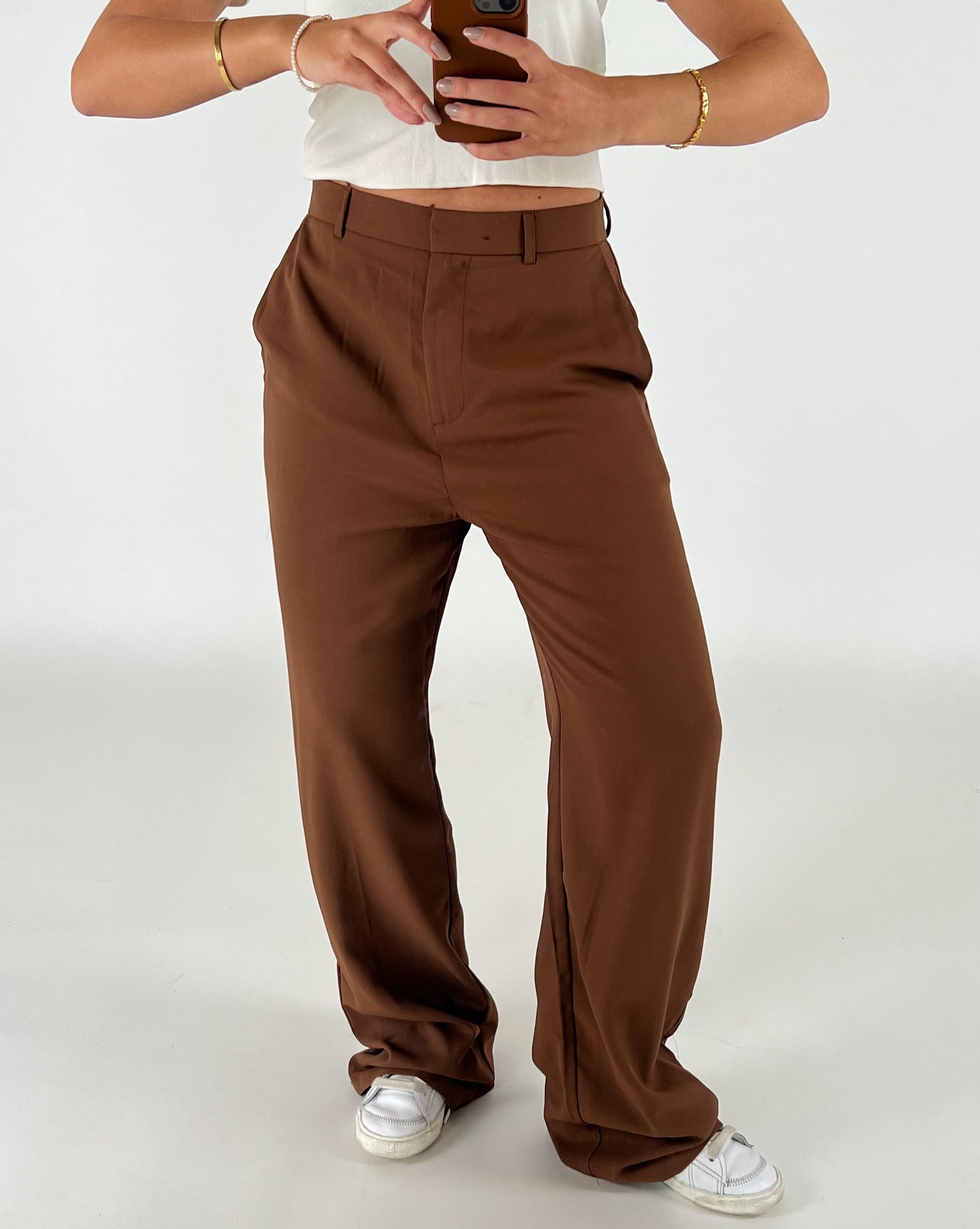 Brune bukser bæres, holdes oppe af en person i en hvid top og hvide sneakers, mens personen holder en telefon. Baggrunden er enkel og lys.