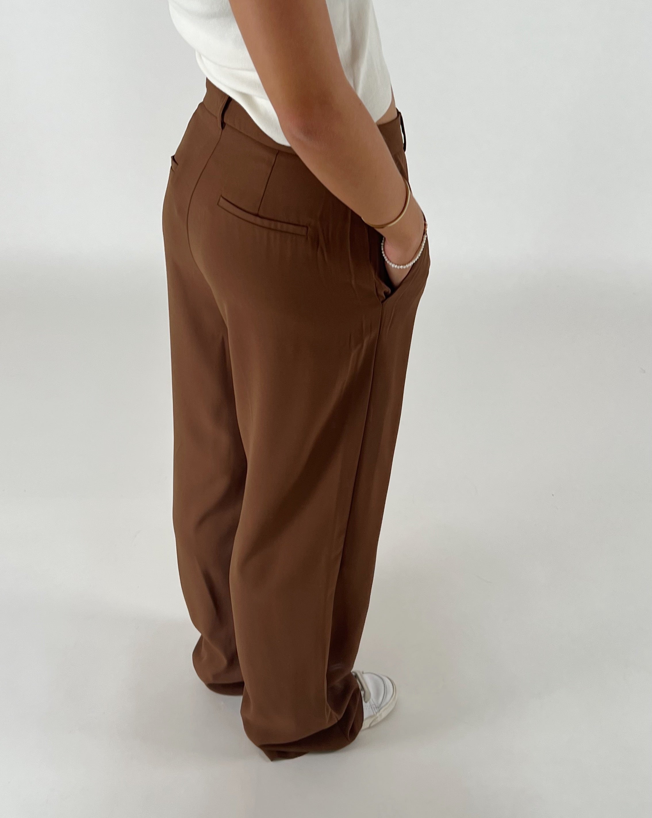 Brune bukser bæres af en person, der står med hånden i lommen. Konteksten er et neutralt, lysegråt rum.