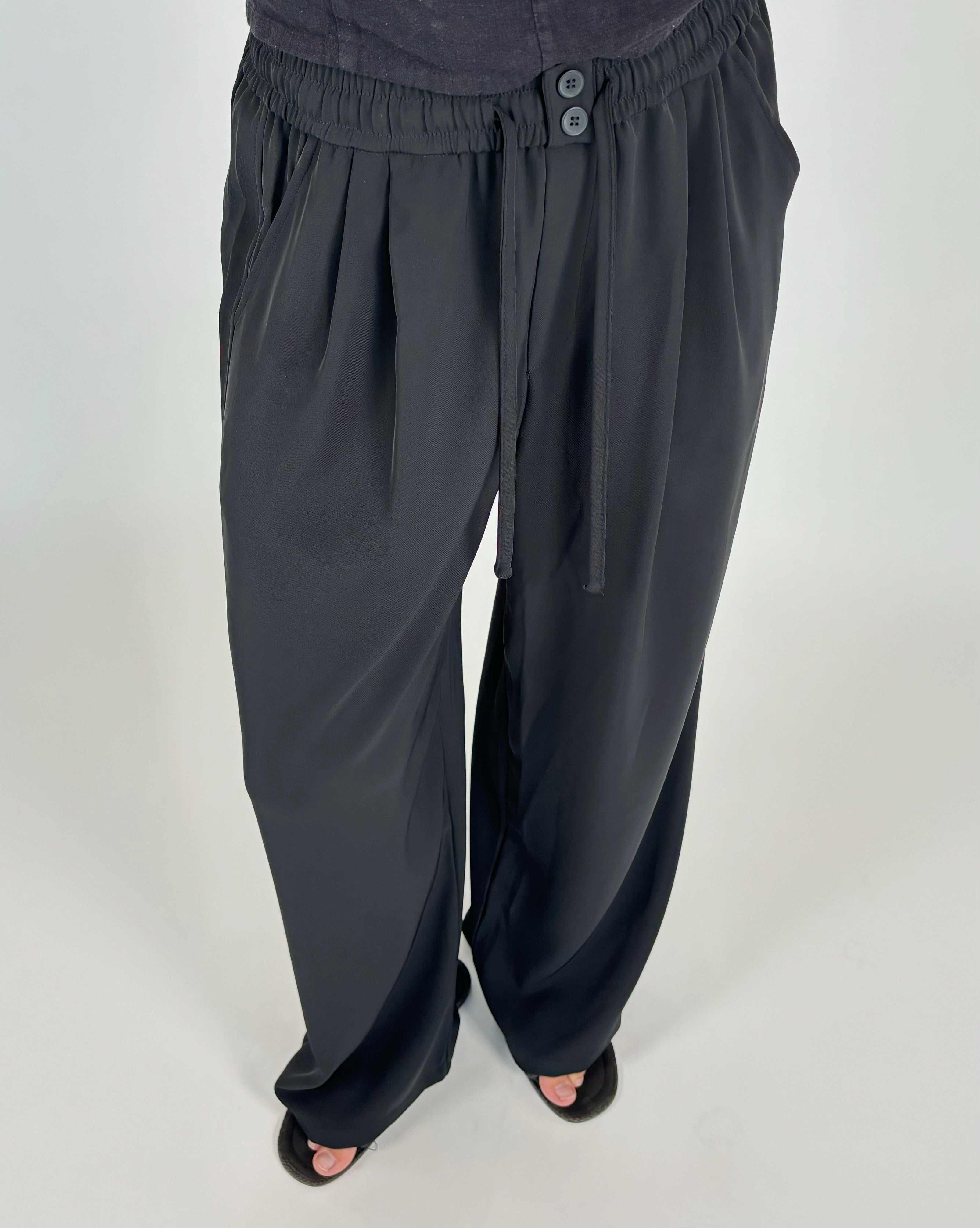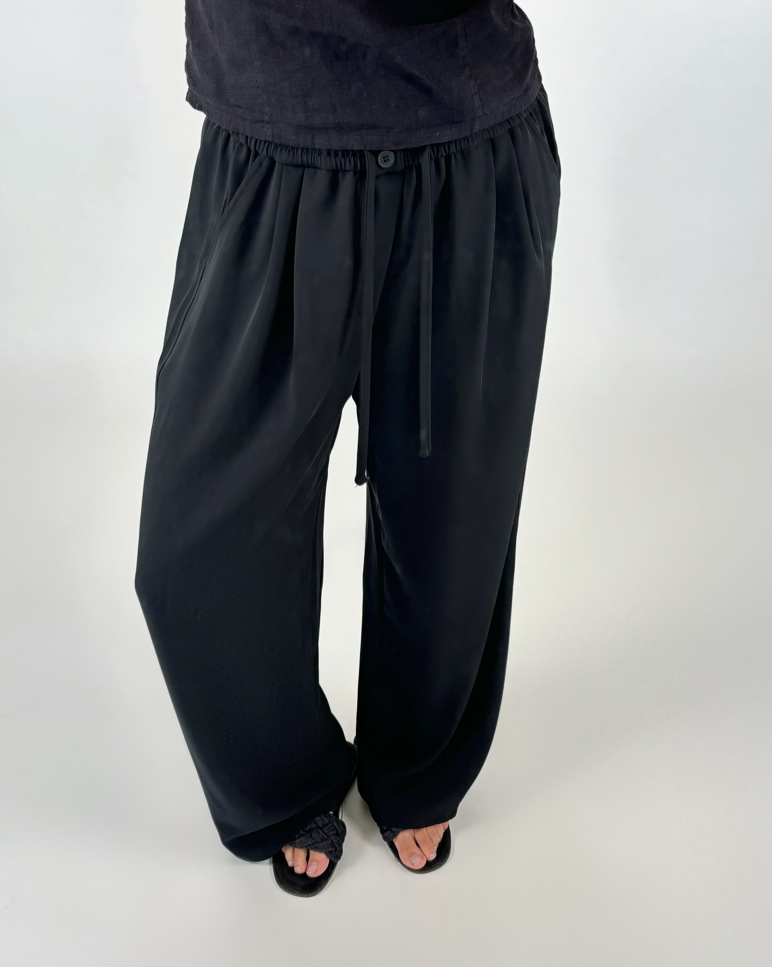 Våra SOLA byxor, svart är lösa i looket, de har elastik samt snörning i midjan.