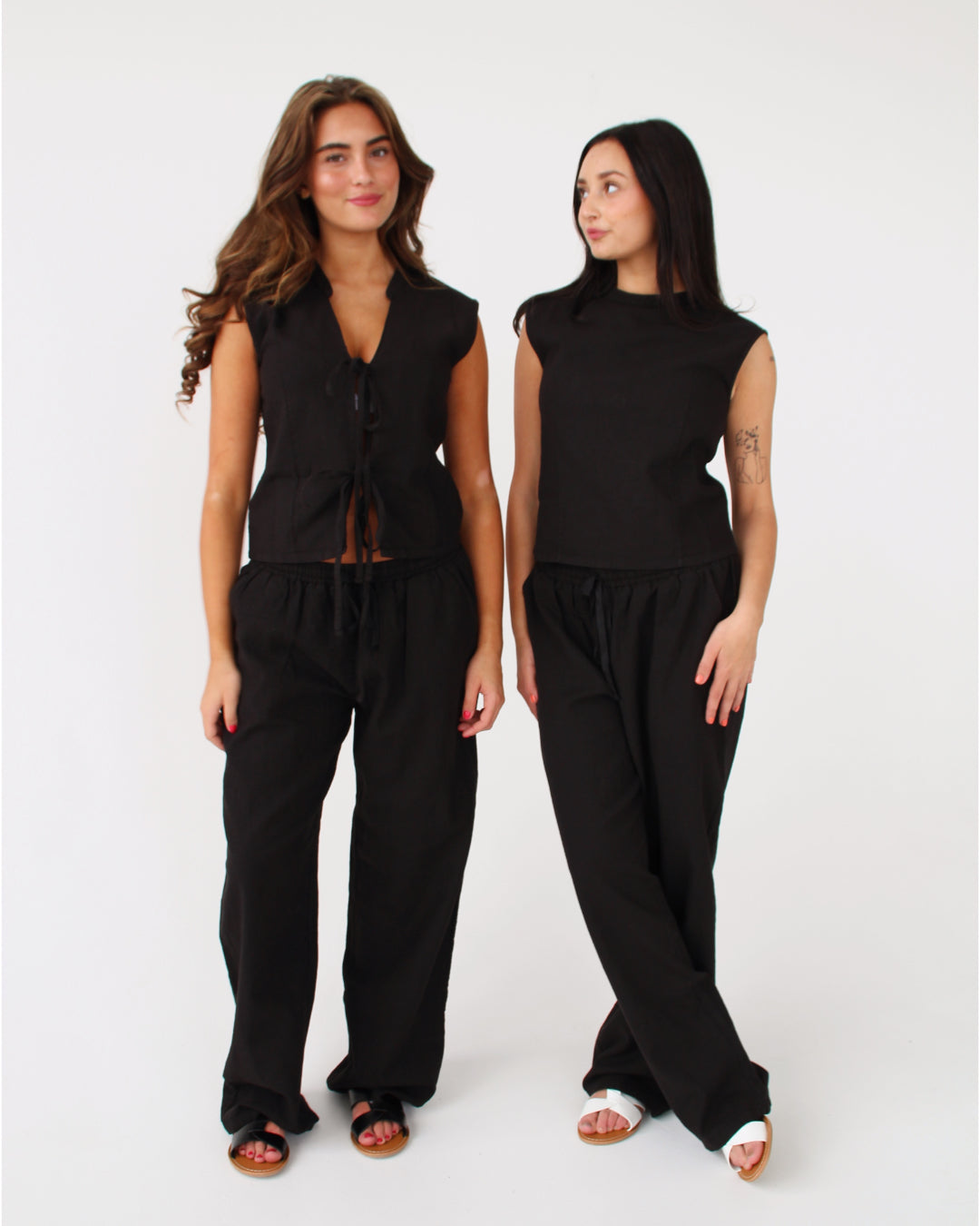 To kvinder iført sort afslappet tøj står sammen. Den ene har en vest og sandaler, den anden en kortærmet top og hvide sandaler. Baggrunden er hvid.