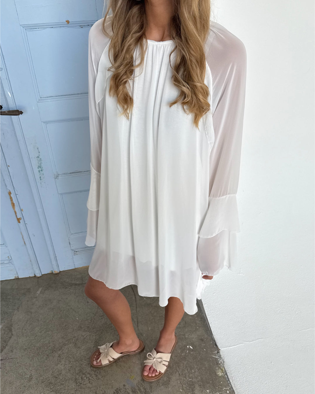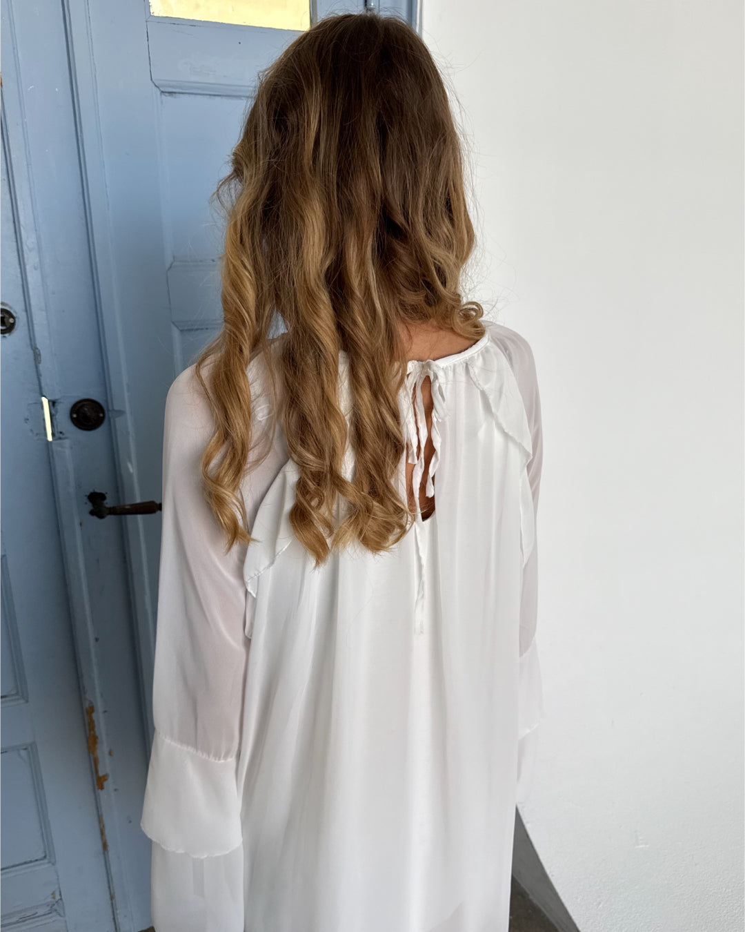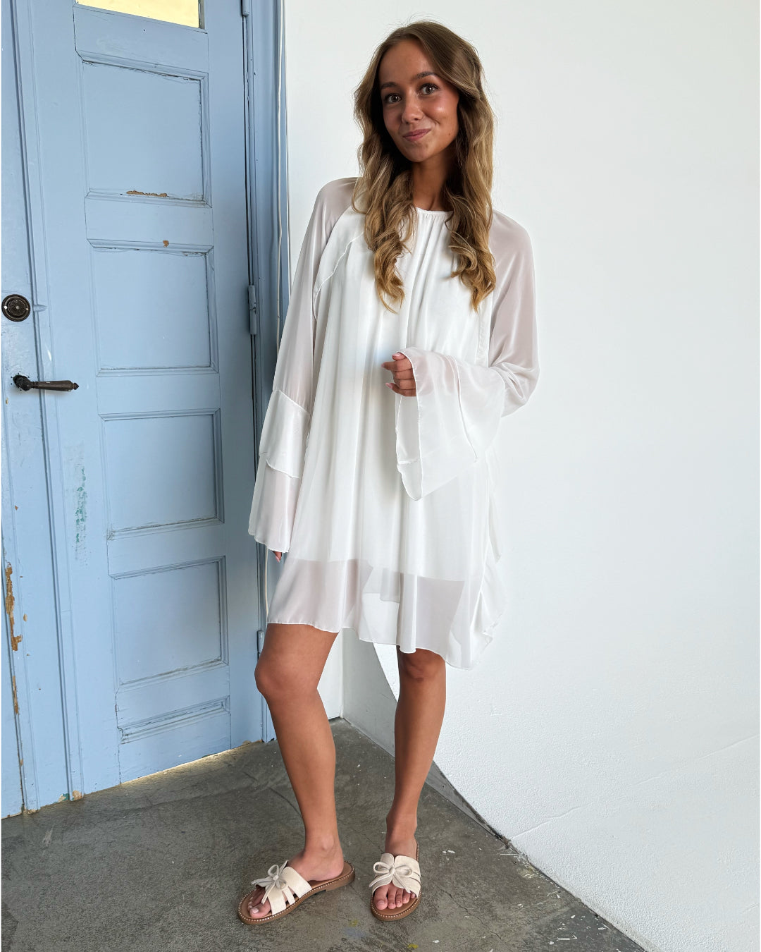 Den vackra BAYLOR klänningen, vit har nu landat i shoppen. Mini klänningen är enkel men med vackra volangdetaljer. Klänningen har ett stycke tyg under, så den inte blir genomskinlig. Klänningen har ett lätt och elegant uttryck. Den perfekta studentklänningen.