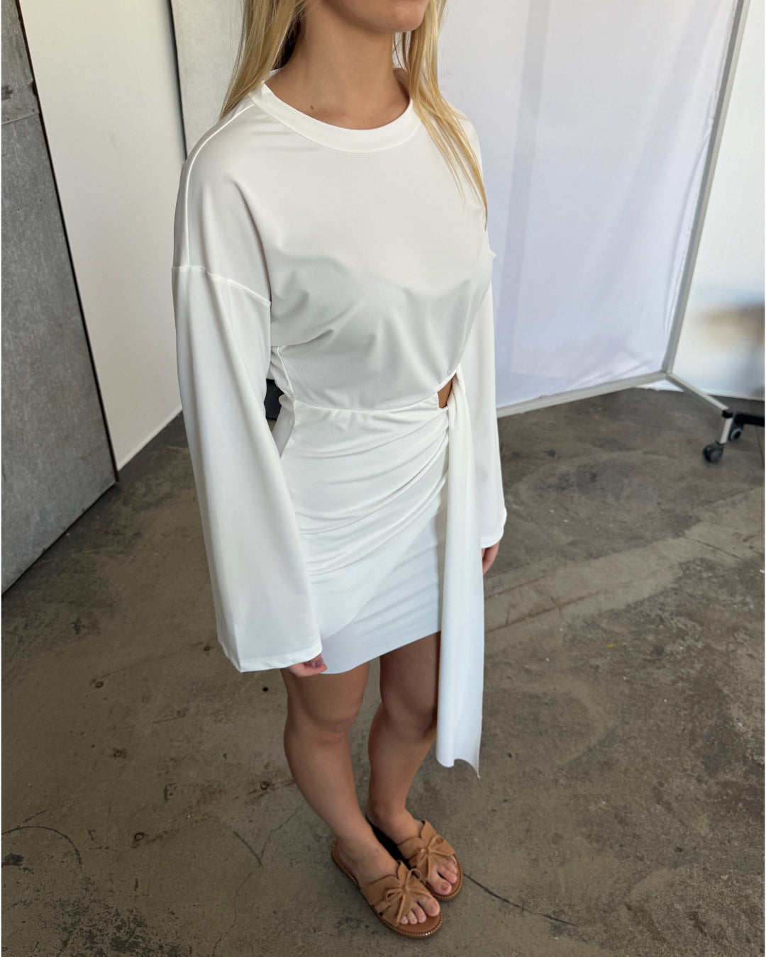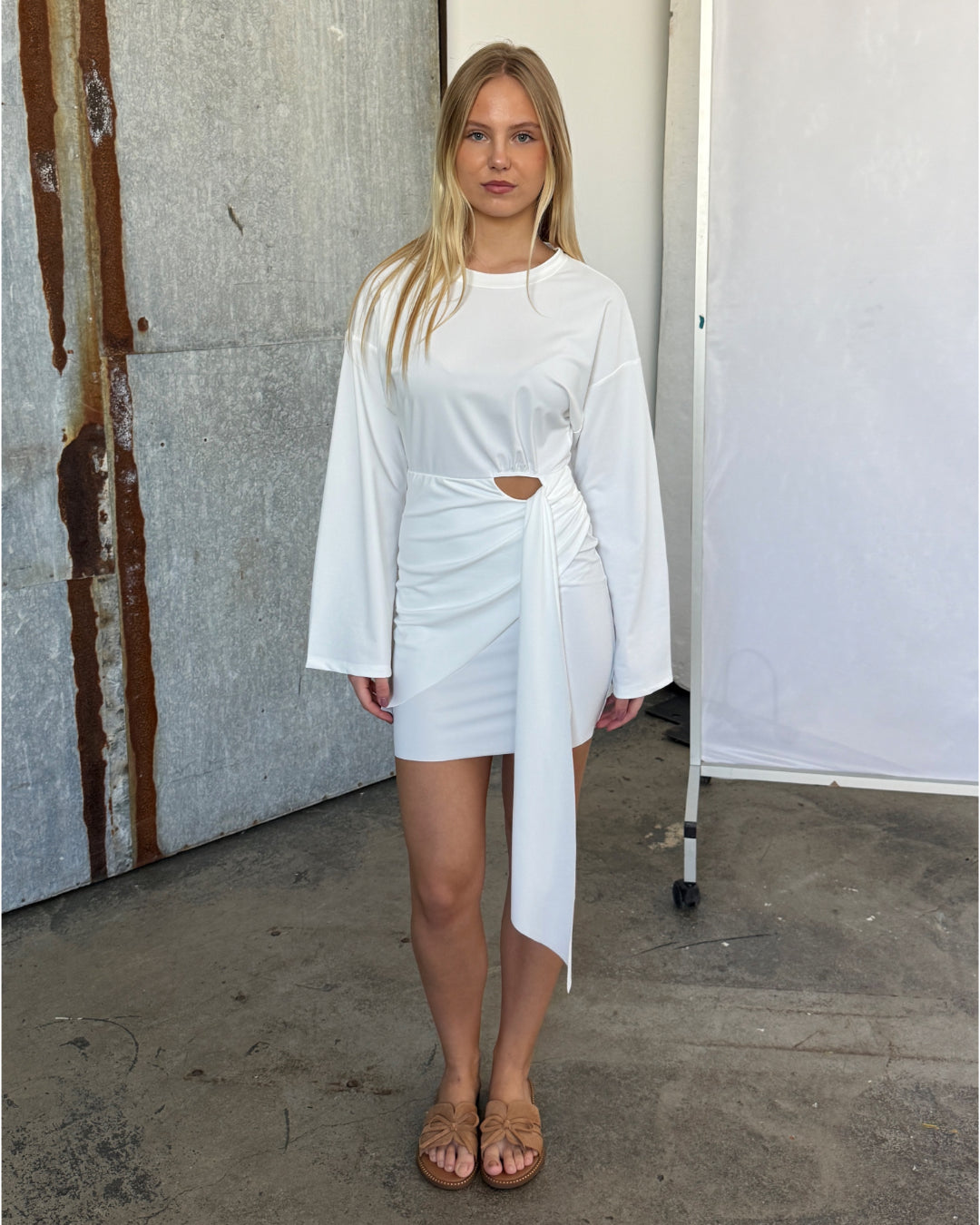 En person bærer en hvid, langærmet kjole med rynkedesign og åbning i taljen. Person står på et betongulv i et rum med hvide vægge og bærer brune sandaler.