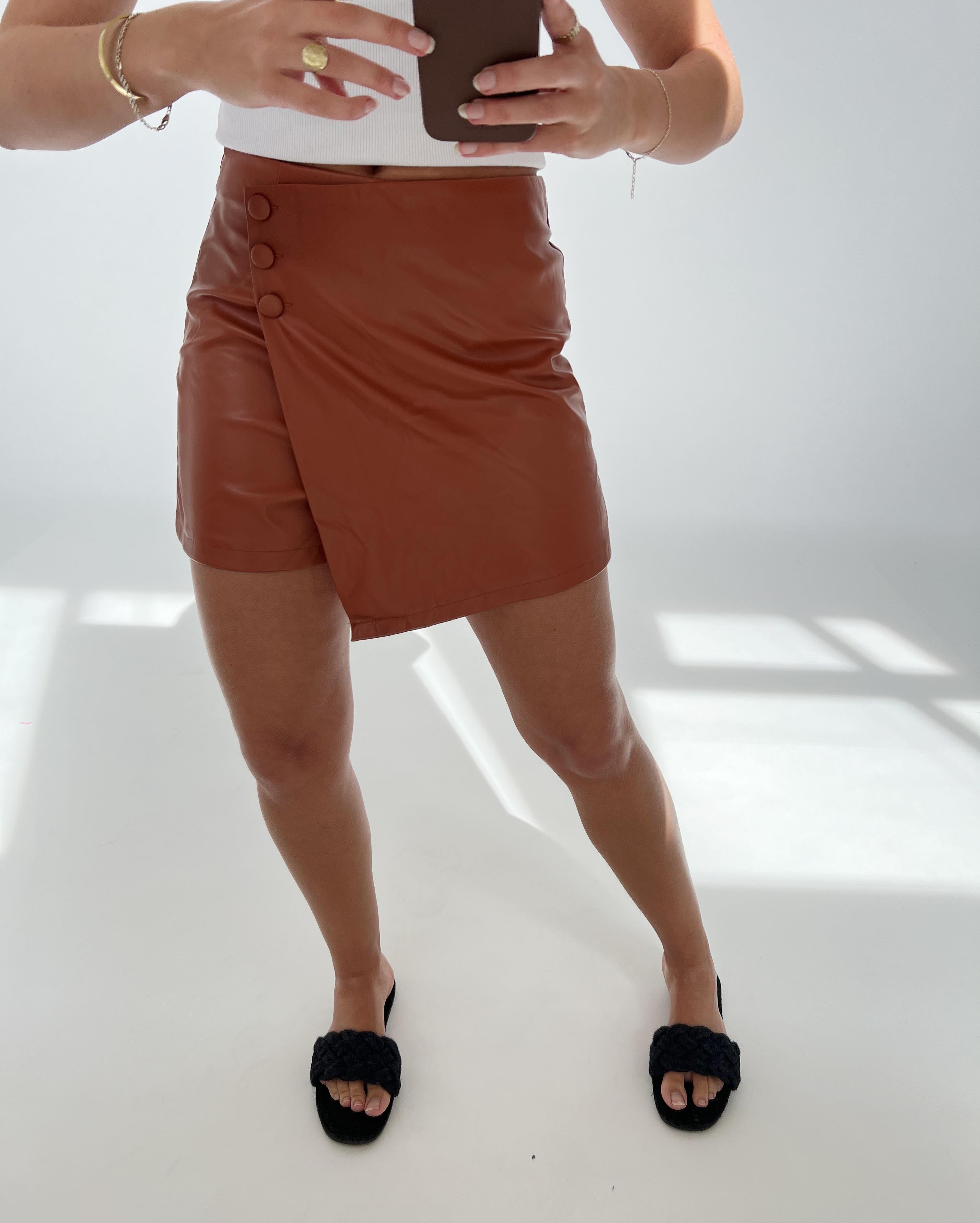 Underdelen är i ett fake läderlook, i en vacker cognacfärgad brun. Den knäpps i sidan, med en osynlig dragkedja, och så finns det knappar som prydnad. Se våra andra shorts HER.