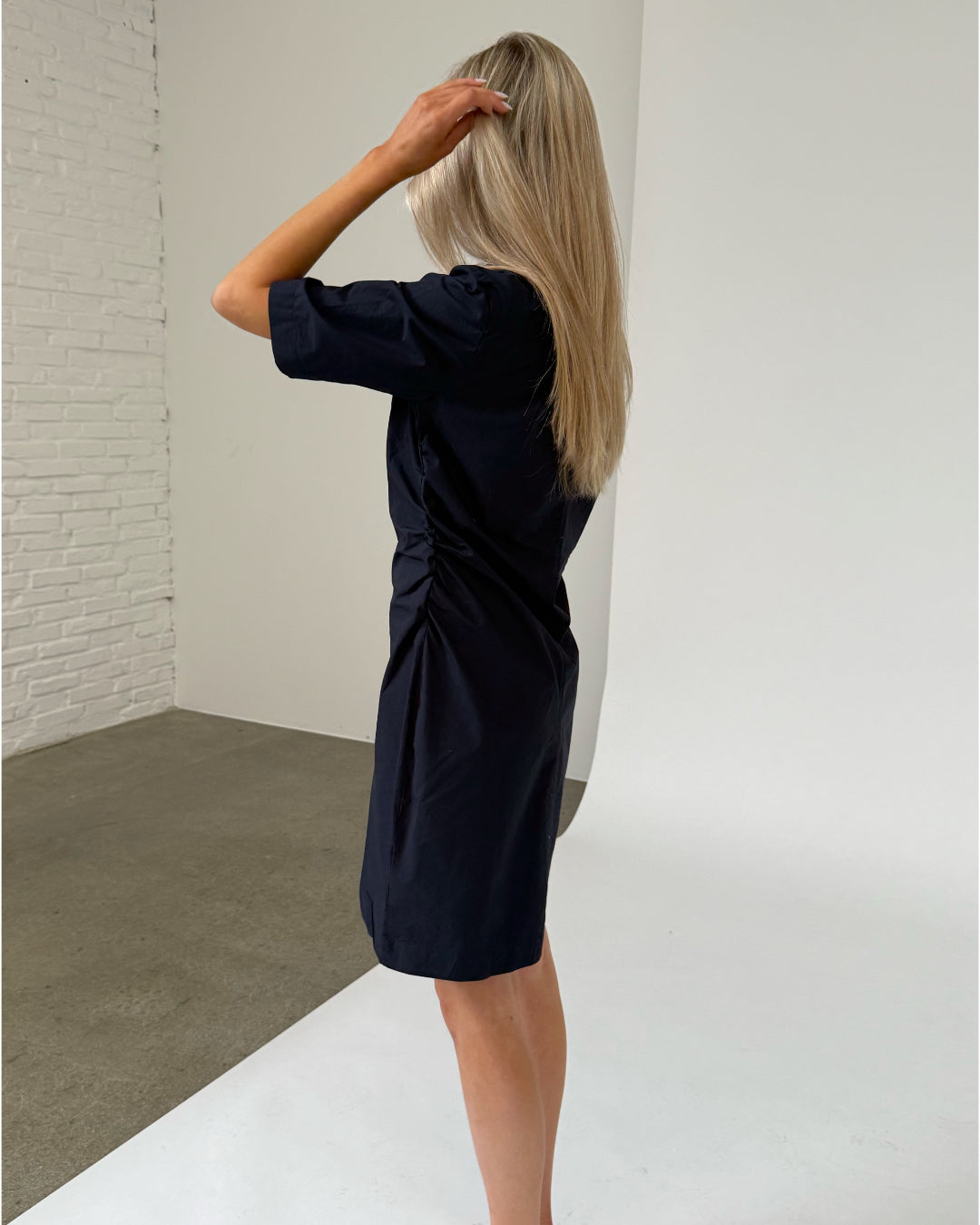 Den vackra OLEANE klänningen, navy är den vackraste midi klänningen med rynkdetaljer i midjan. Midi klänningen har vackra detaljer och på grund av rynkdetaljerna i sidan, framhäver den vackert din midja.