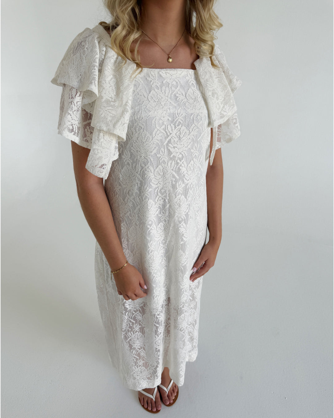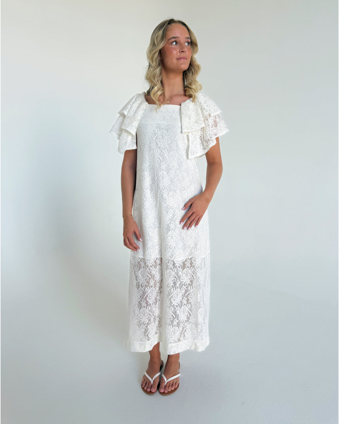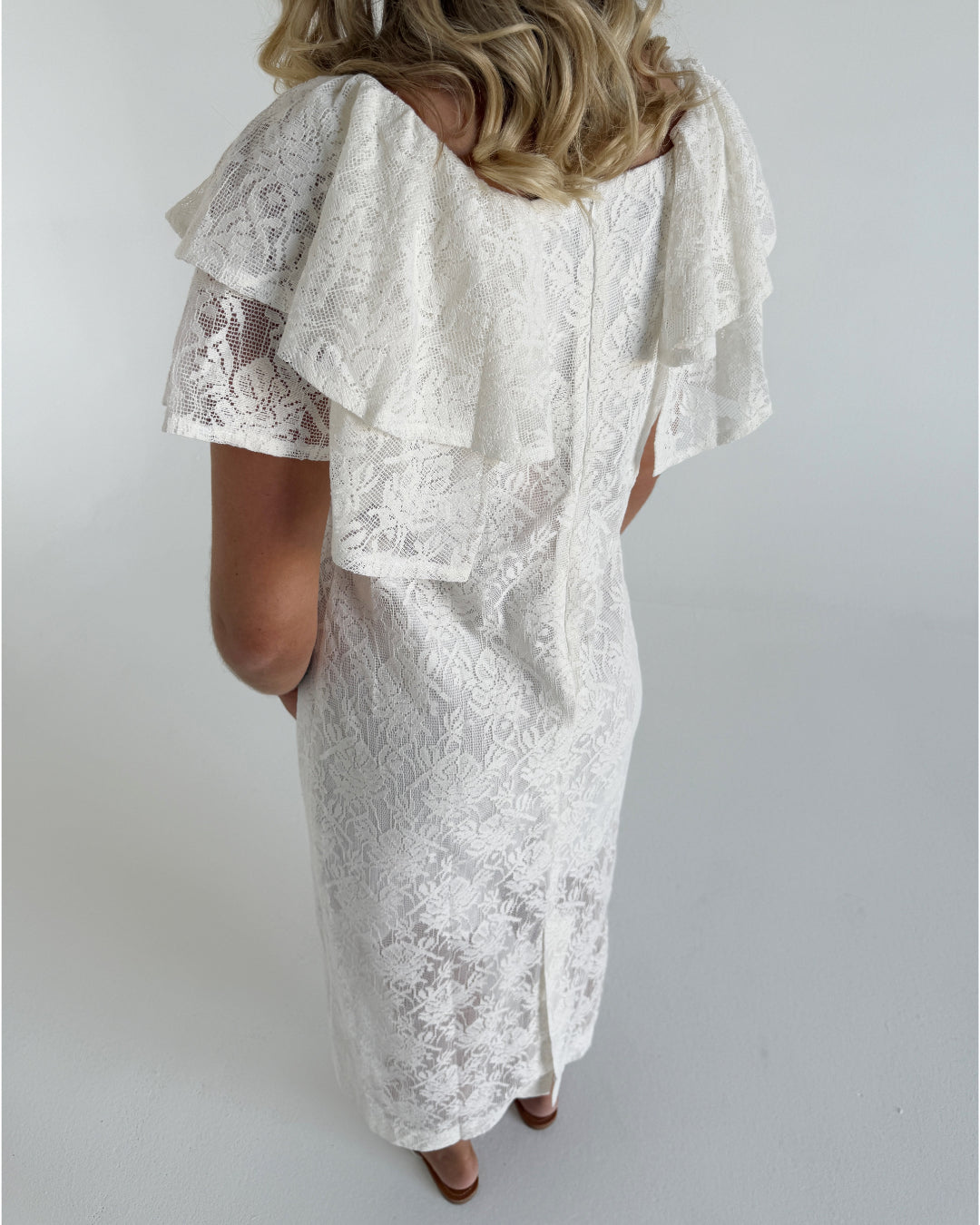 En kvinde iført en hvid, blondekjole står i et neutralt belyst rum. Hun bærer sandaler og har krøllet hår. En diskret halskæde og armbånd fuldender hendes udseende.