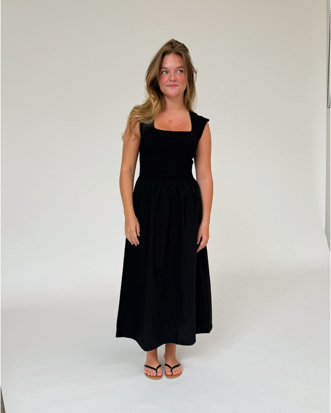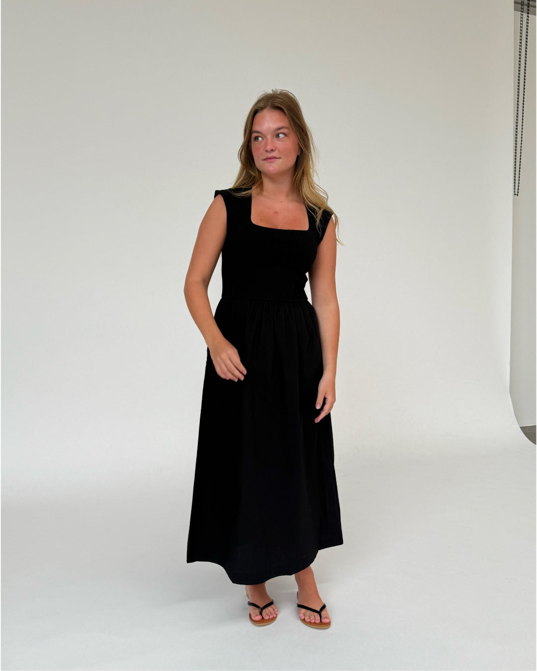 En kvinde iført en sort kjole står stille i et minimalistisk rum med hvid baggrund, ser lidt til siden med afslappet kropsholdning.