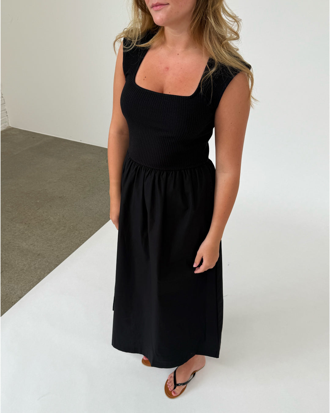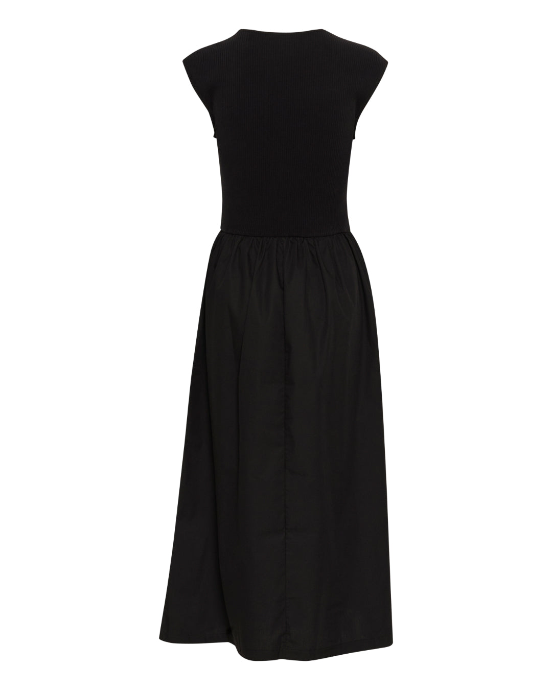 Sort kjole uden ærmer hænger frit mod en hvid baggrund. Toppens stof er strikket, mens nederdelen er glat og løstsiddende.