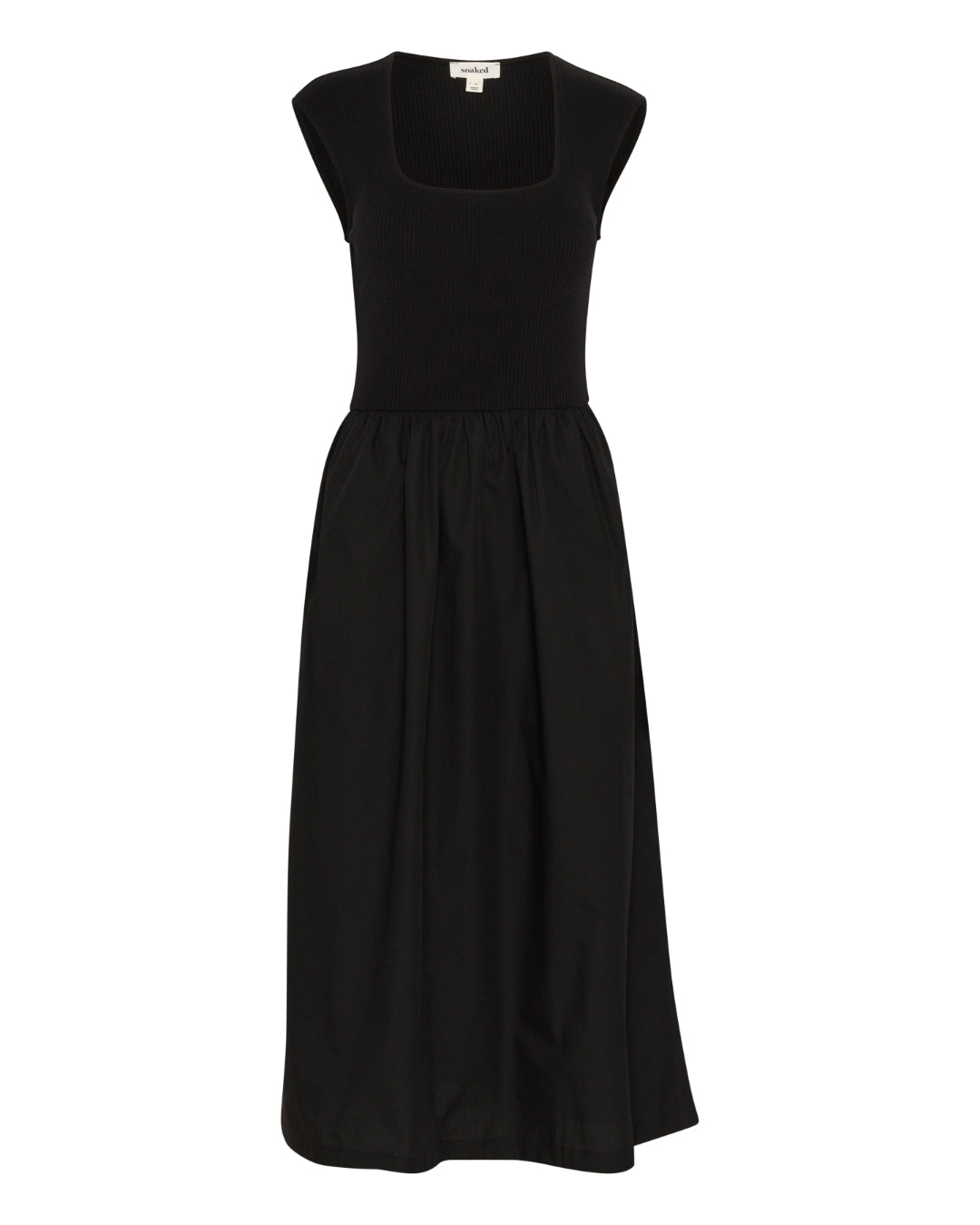 En sort kjole med firkantet halsudskæring og ærmeløst design hænger frit. Nederdelen er løs og skørtet er knælængde. Baggrunden er hvid. Etiketten øverst viser teksten "Selected."