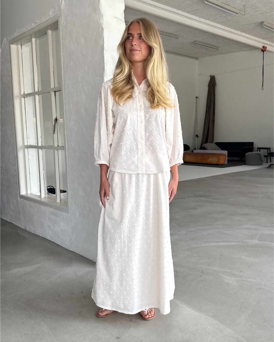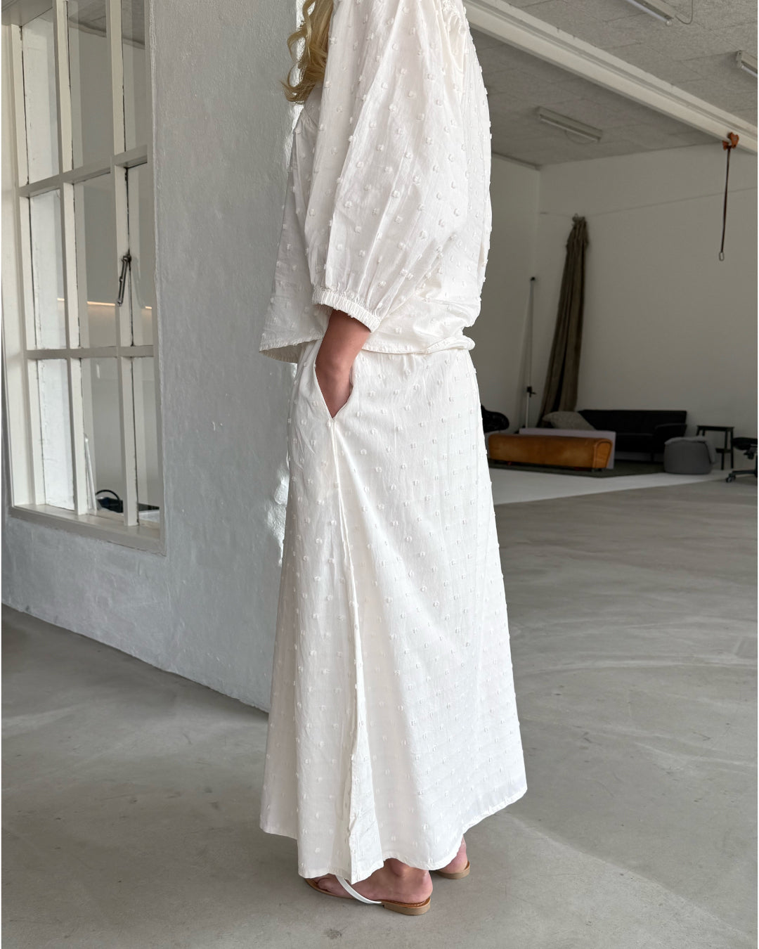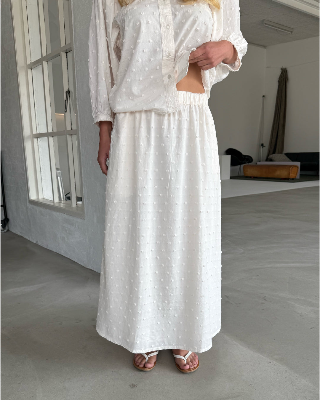Vår vackra maxi SUNELA kjol, vit har en vacker struktur i tyget och elastik i midjan. Den A-formade kjolen har sidfickor och har dubbelt lager, så den inte är genomskinlig.