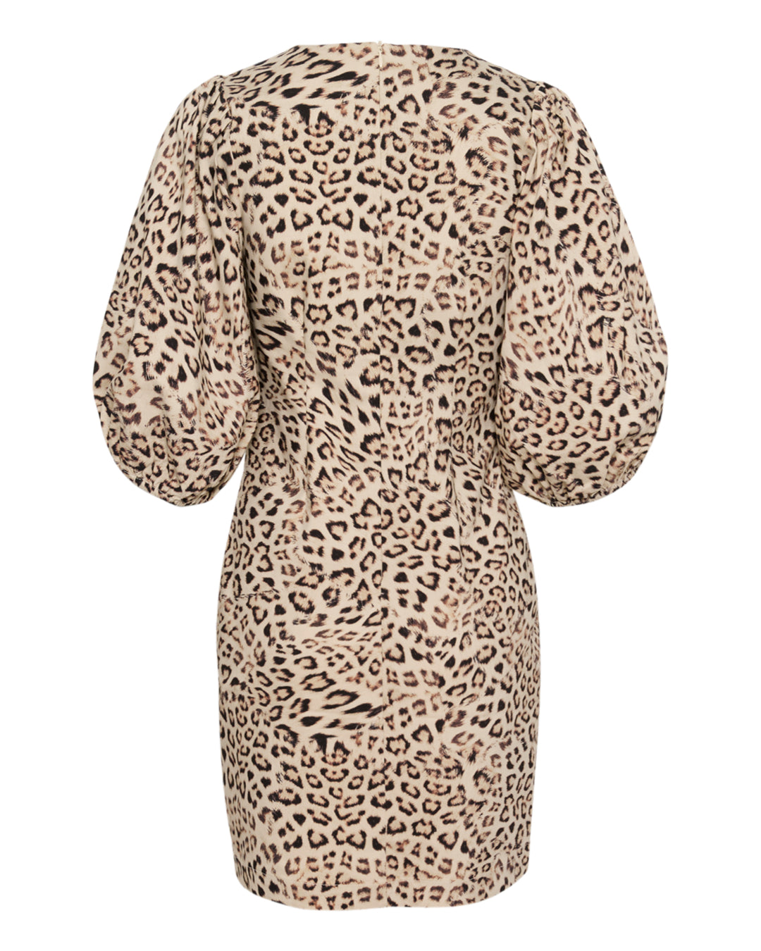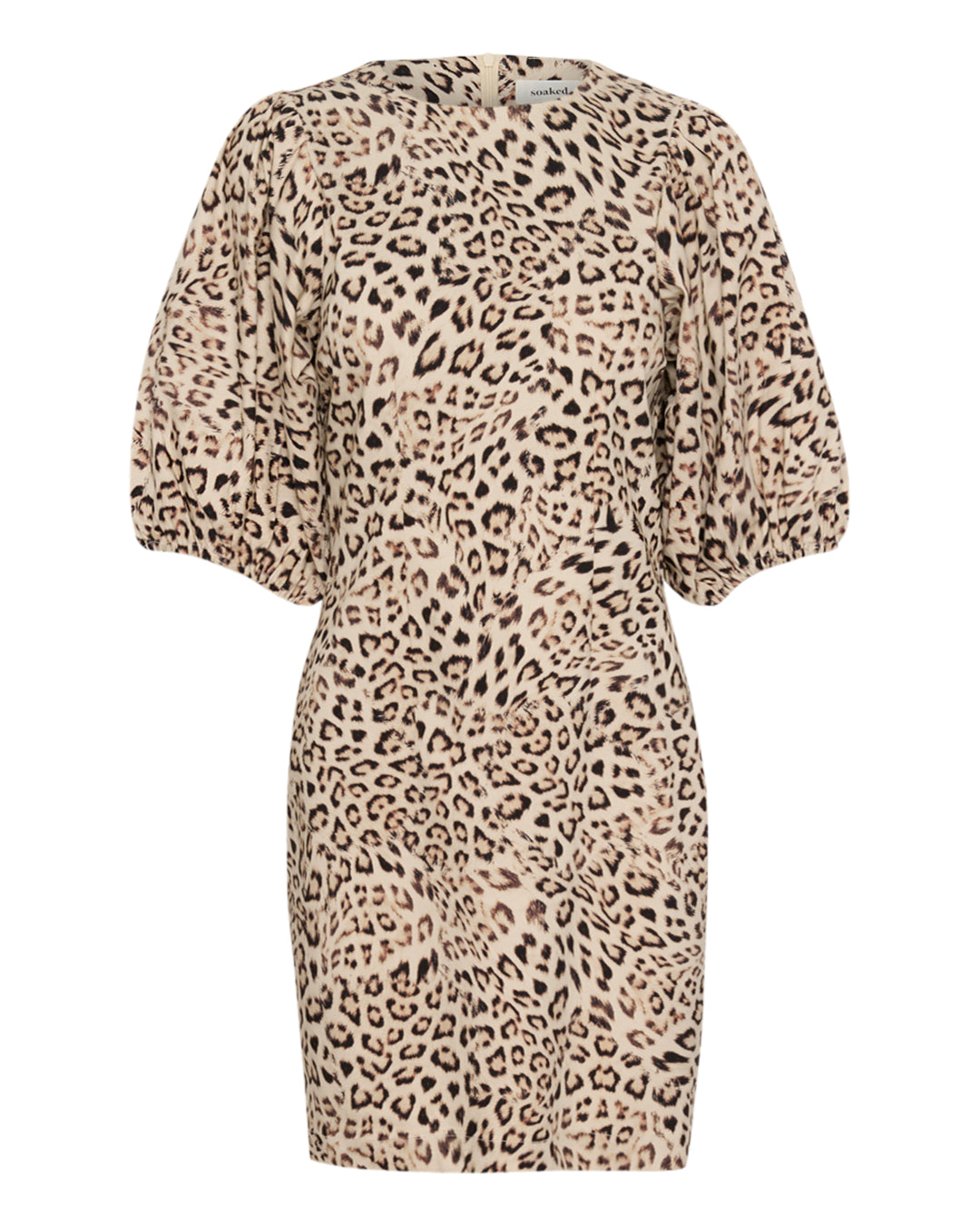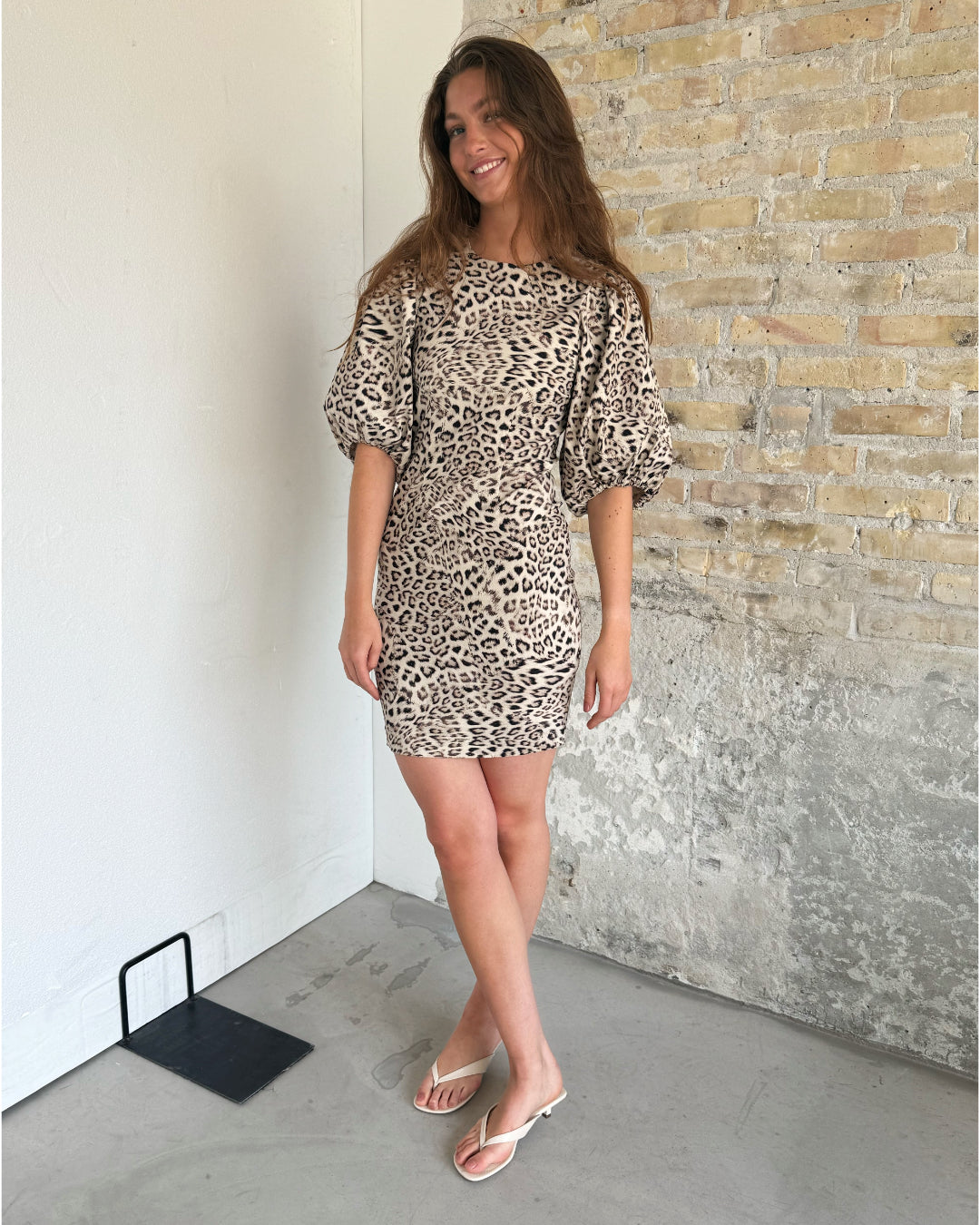 ZAZU klänning, leopard sitter vackert och formar sig fint efter kroppens former. ZAZU klänning, leopard är en kort klänning med stora och fylliga 3/4 ärmar. Den har rund hals och är gjord i härligt stretchigt tyg med det vackraste leopardmönstret.