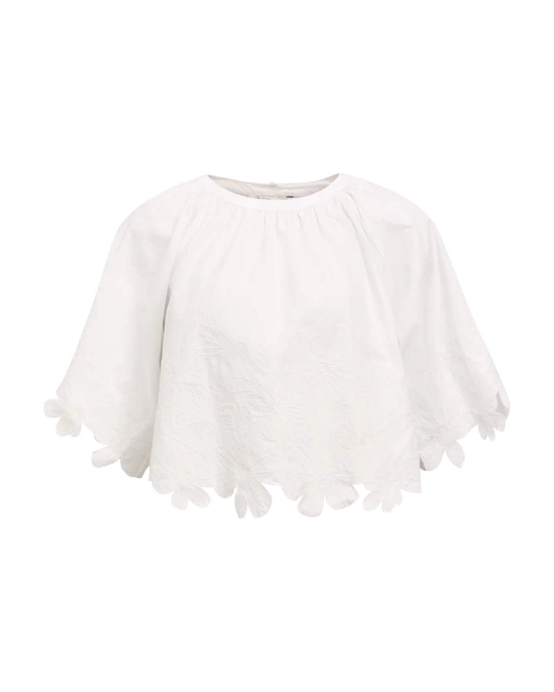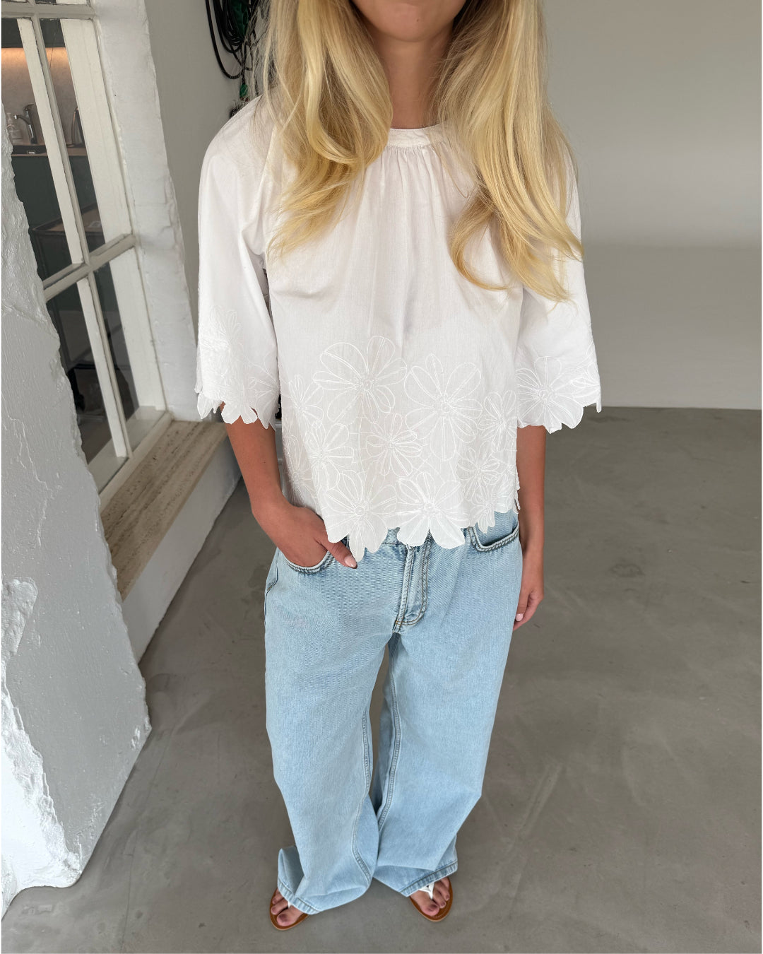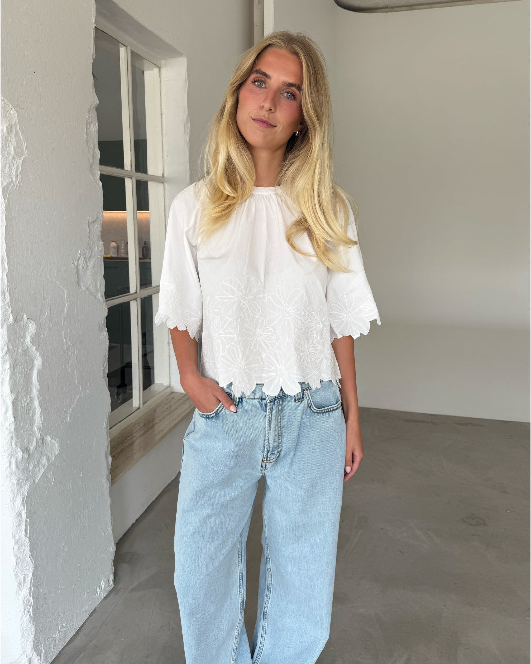 Den vackra KAMMA blusen, vit har de finaste broderade blommorna detaljer på den kortärmade blusen. Blusen är en aning cropped.
