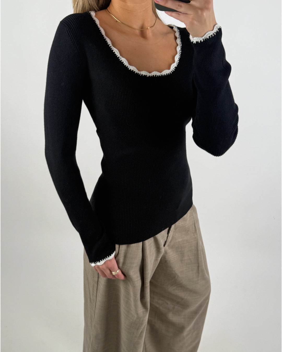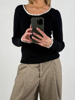 Vacker, feminin ELLA-blus, svart/vit i mjuk ribstickning – perfekt som bas i garderoben året runt. Blusen finns i tre klassiska färgvarianter: ljusgrå med vit kant, svart med vit kant, samt vit med svart kant.