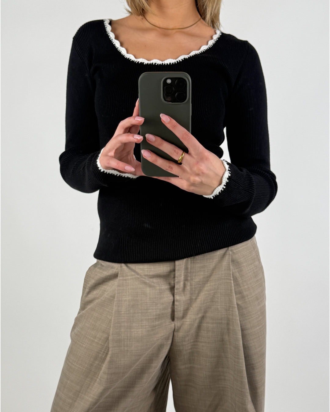 – Fin kontrastkant vid hals och handled.