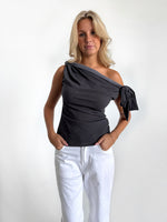 MAISIE off shoulder toppen, grå ska knytas vid den ena axeln och får därmed en fin detalj.