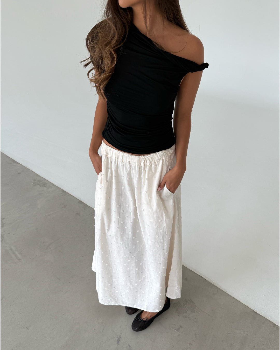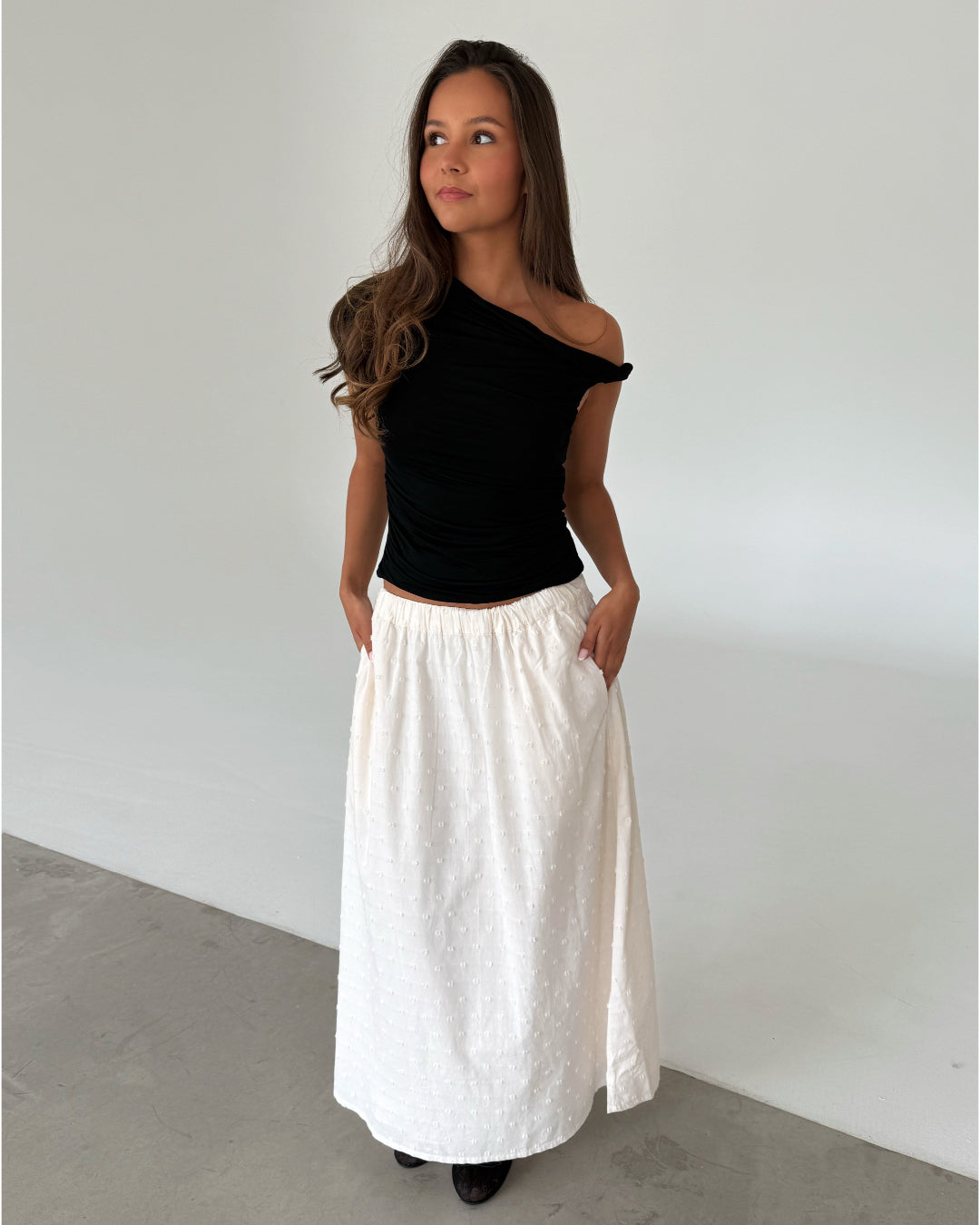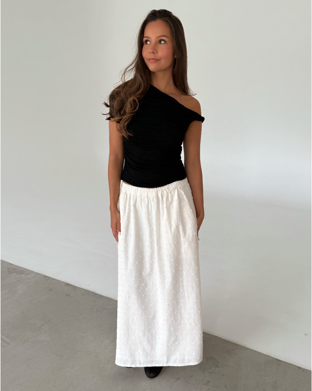 Modelfoto af pige som bærer en sort oneshoulder MILENA top, samt en hvid nederdel og sorte ballerinasko. Alt er fra BySofieSønderby