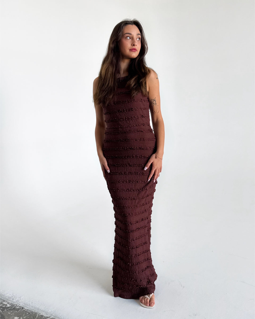 Vår KIMBERLY klänning, brun är en vacker maxiklänning, i en otroligt feminin look.