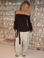 Den vackra SAVANNA off shoulder sticka, brun är en vacker stickad blus med off shoulder look och bindeband i midjan.