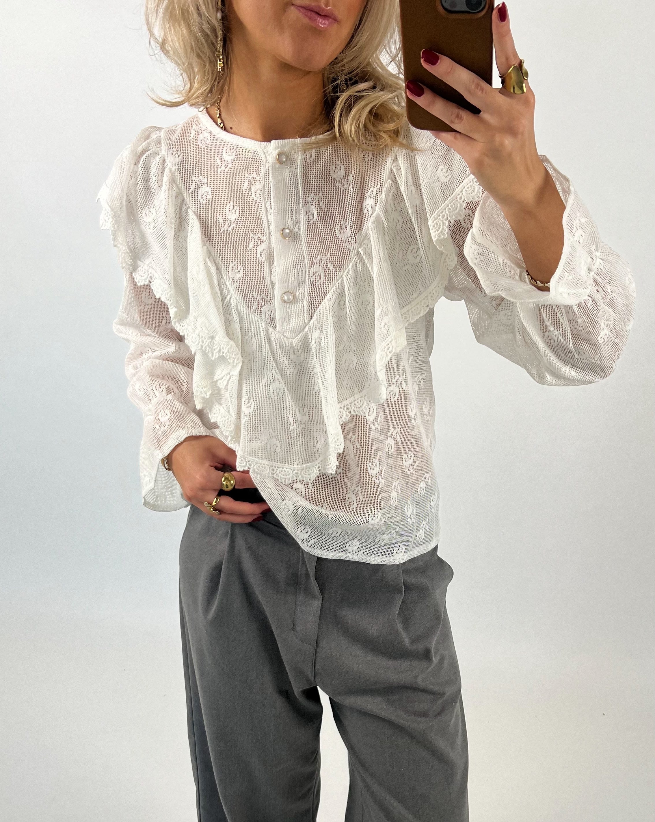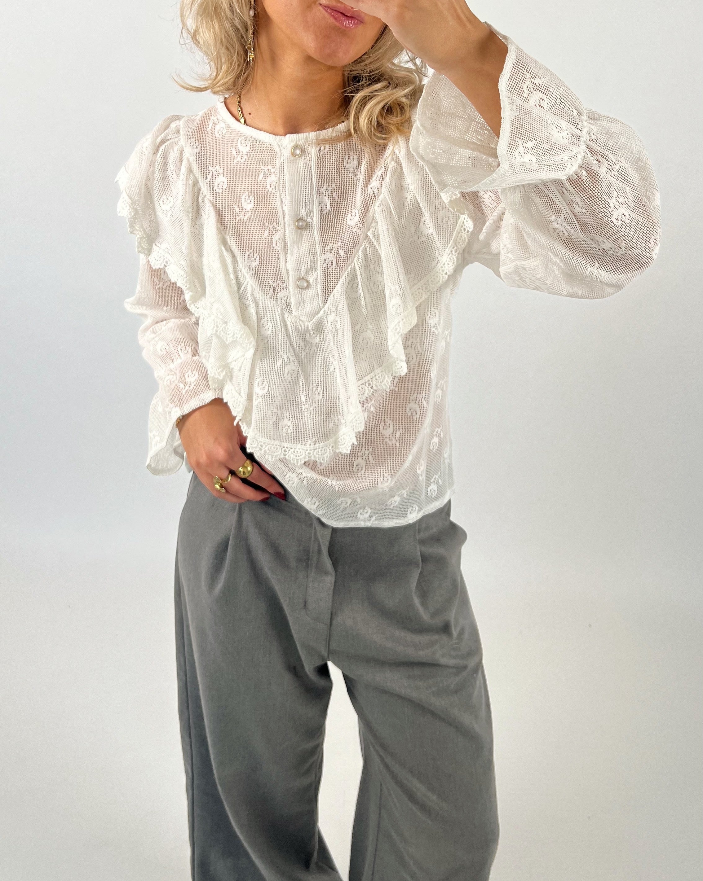 Vår AURORA blus, vit är en vacker långärmad skjorta i blondestil, som ger din outfit en feminin look.