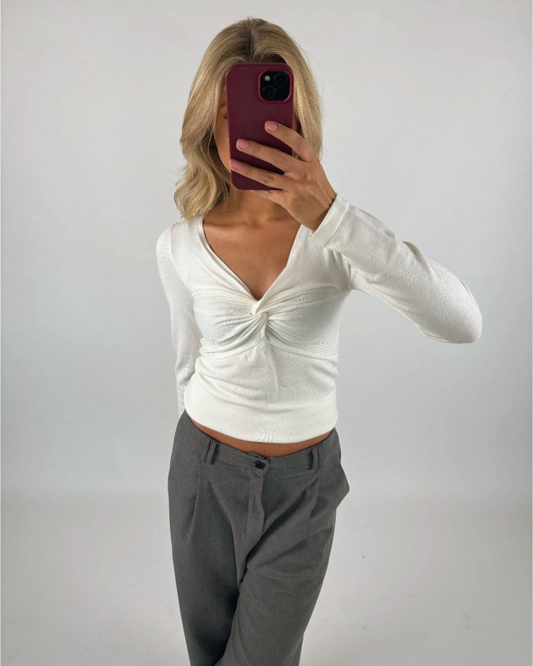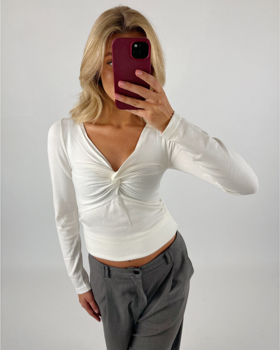 Vår AMAIA blus, vit är en vacker långärmad blus i ett tunt stickat material.