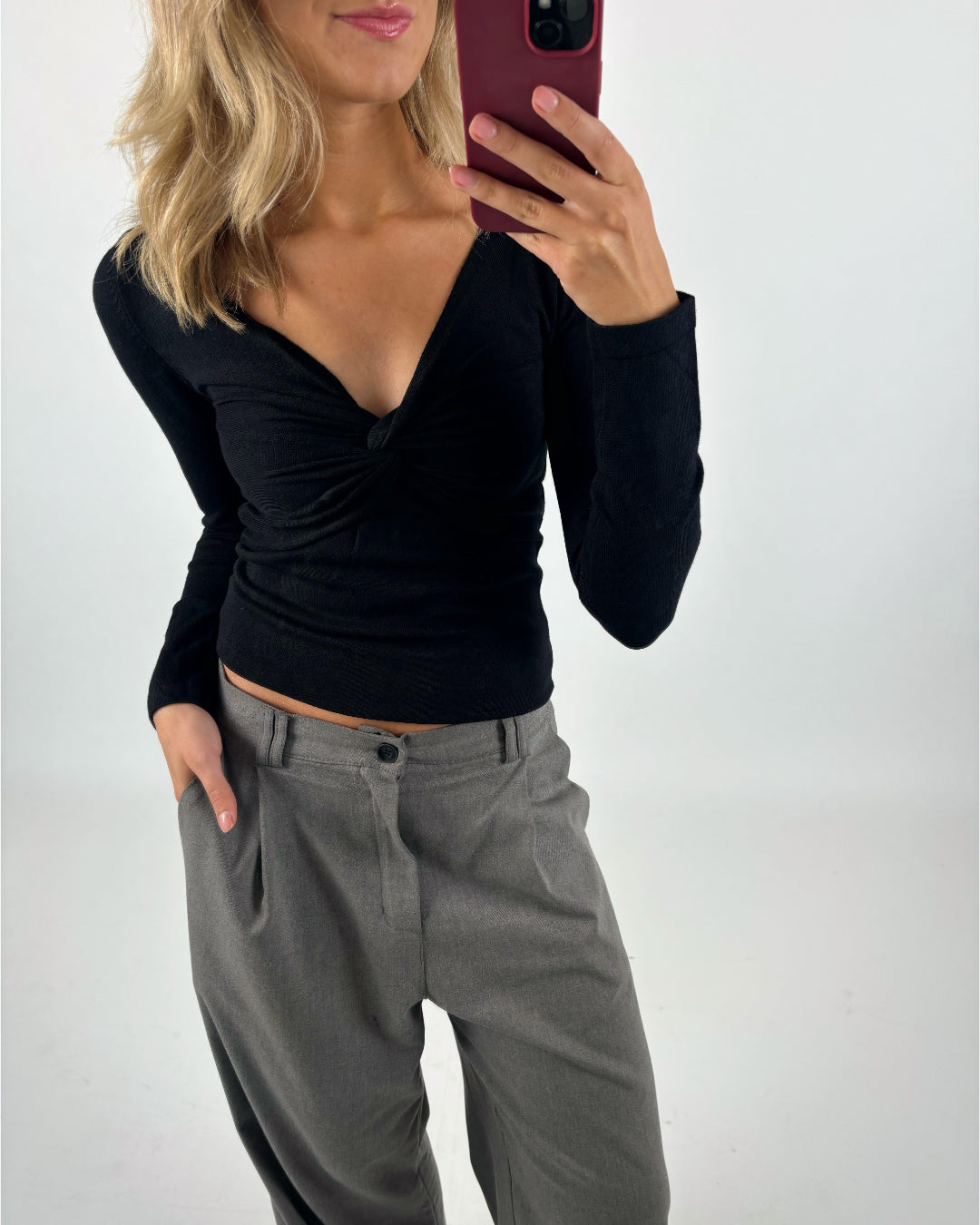Vår AMAIA blus, svart är en vacker långärmad blus i ett tunt stickat material.
