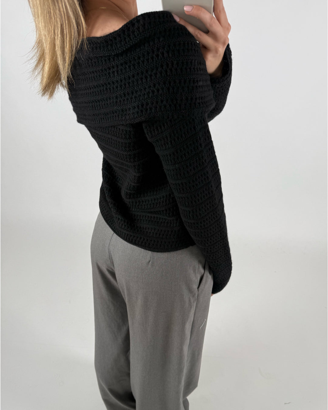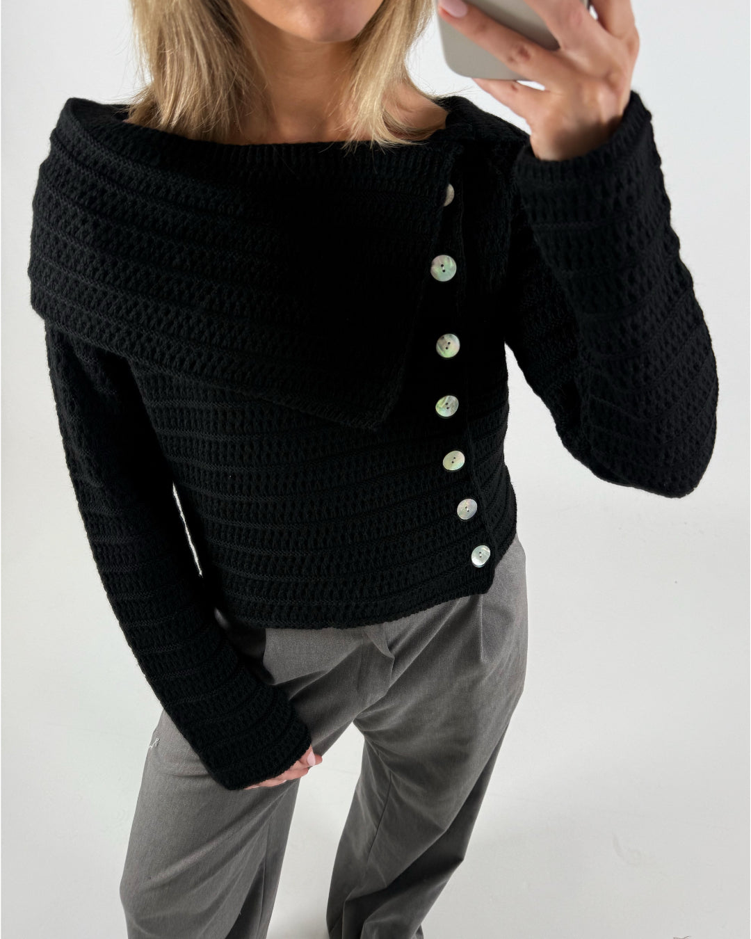 En person bærer en sort strikbluse med knapper langs siden, fotograferet i et rum med en lys baggrund, mens de tager et spejlbillede og har grå bukser på.