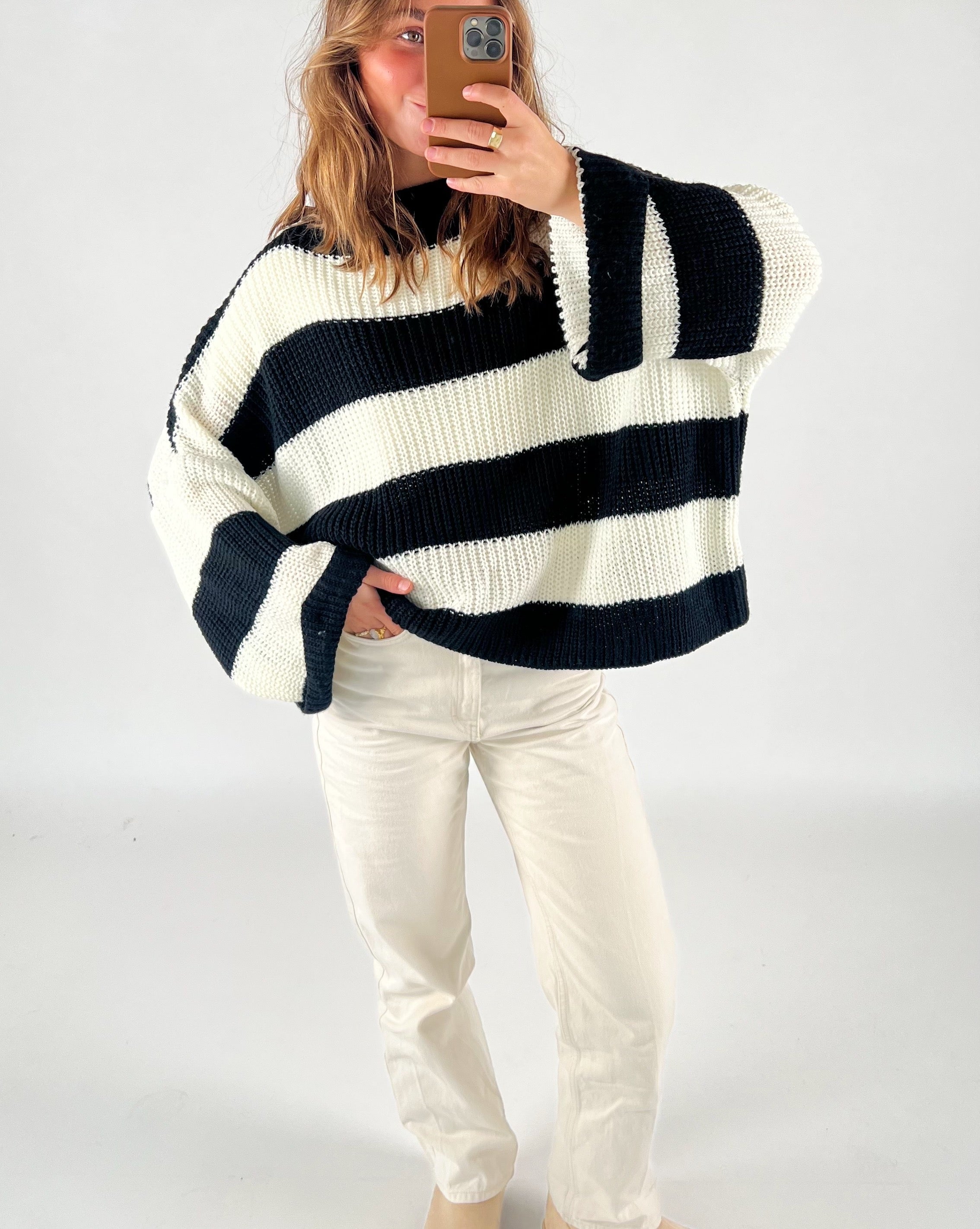 Stickan är löst stickad, har breda ränder och vida ärmar med en liten uppvikning i änden av ärmen.