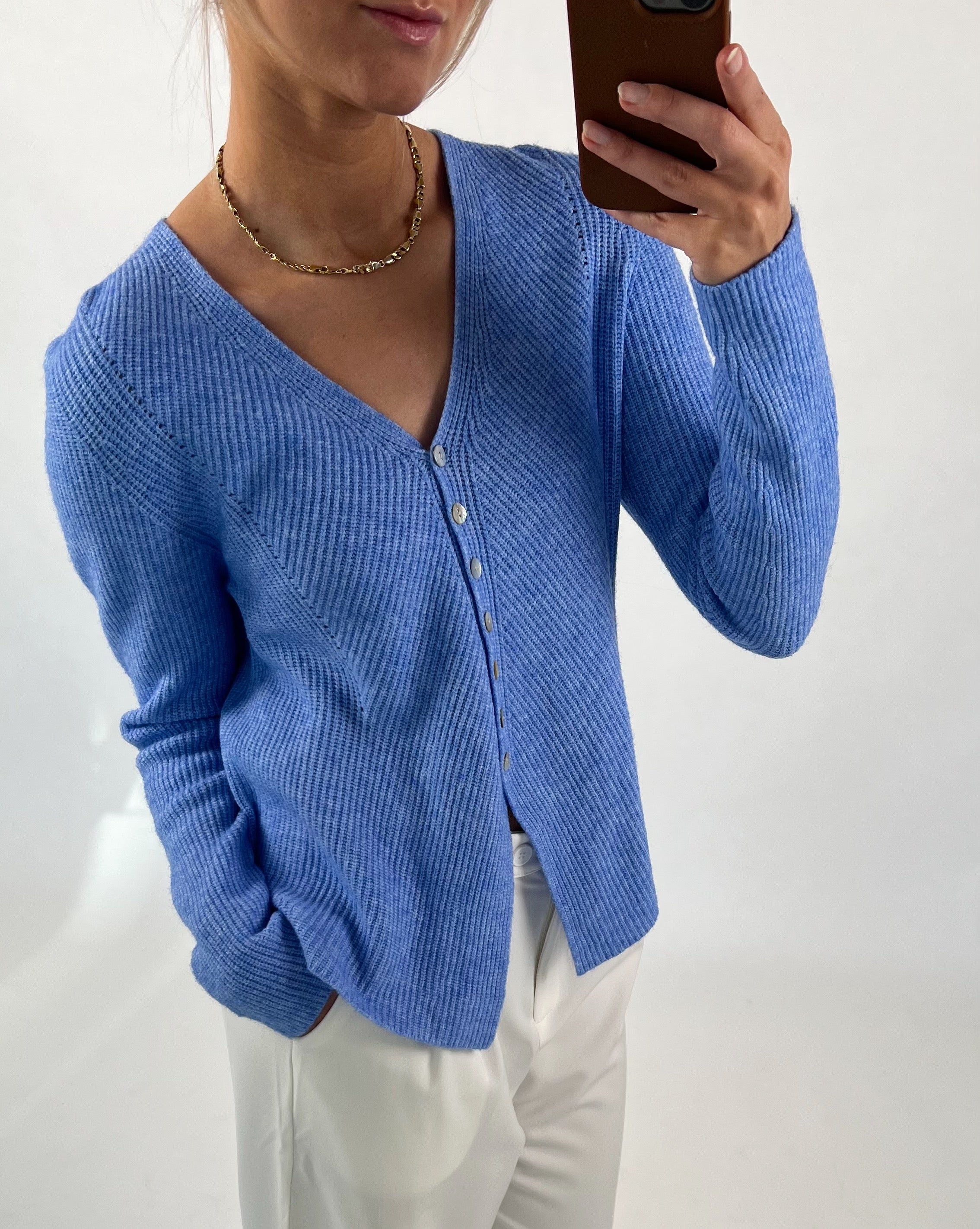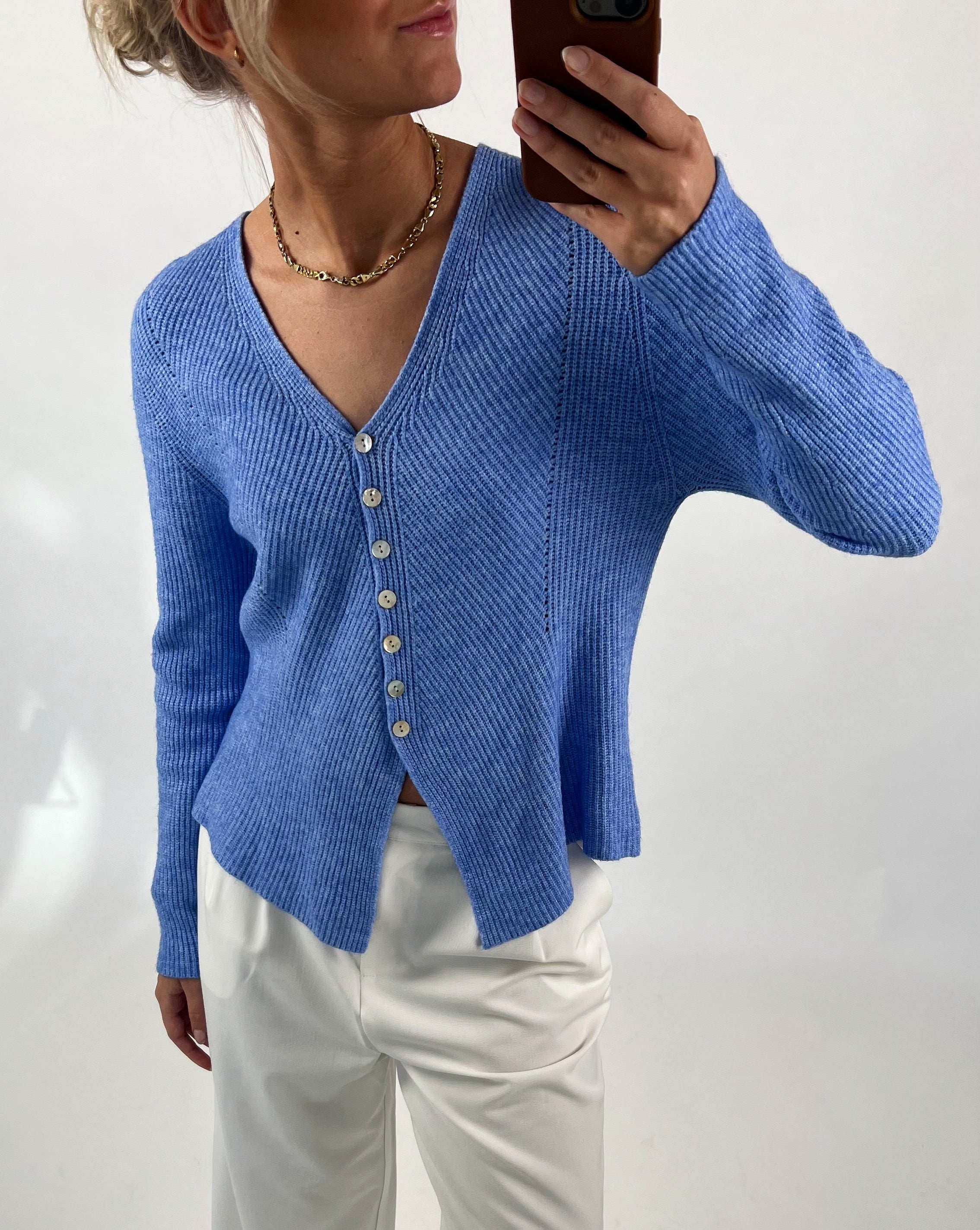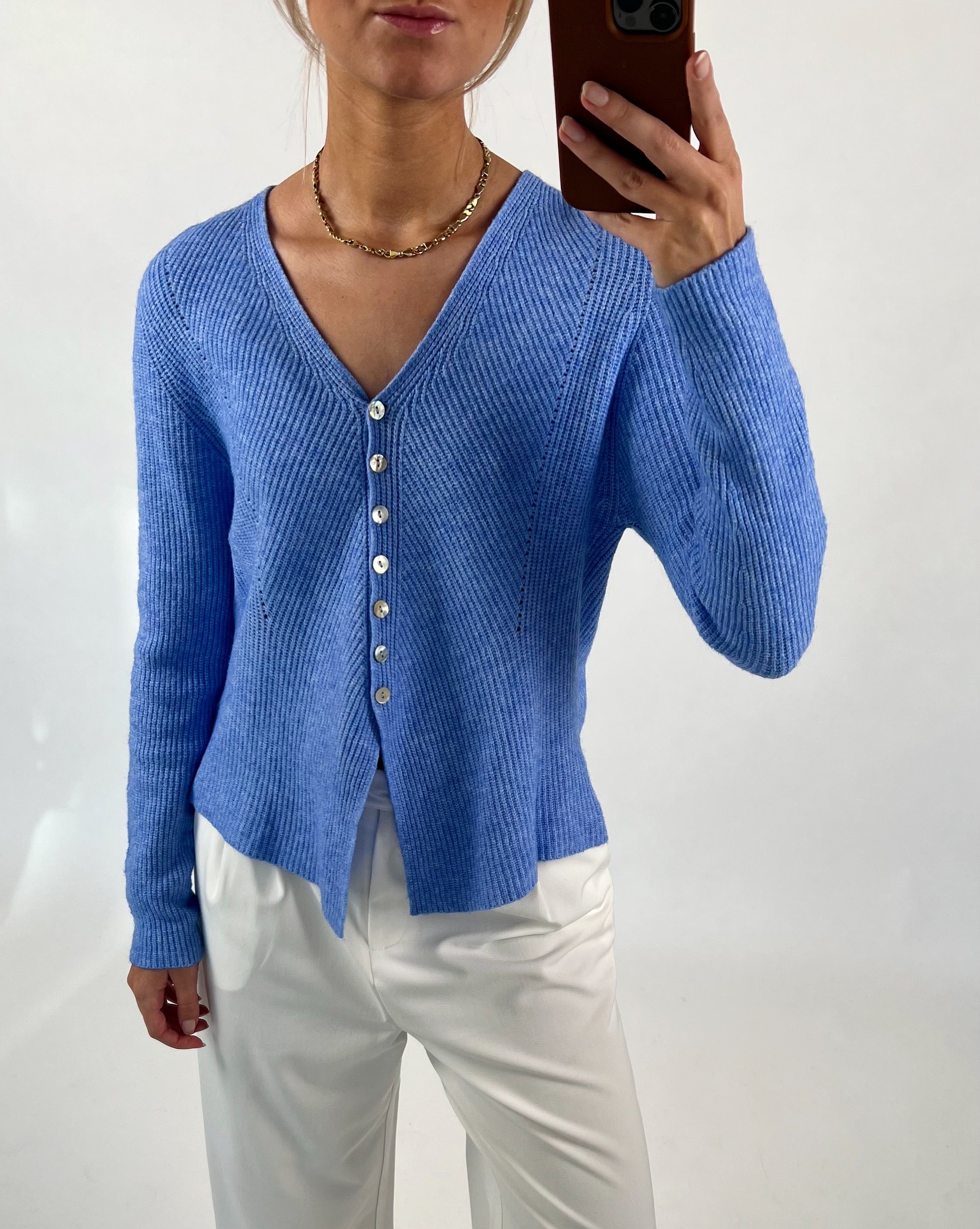 Vår LAYLA cardigan, blå är den perfekta detaljerade cardigan, som är ett klart måste i garderoben.