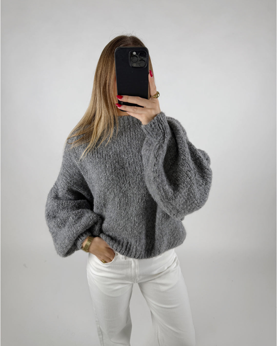 En person iført en grå sweater tager en selfie med en sort smartphone. Personen har hvidt tøj på og rød neglelak. Baggrunden er ensfarvet hvid.