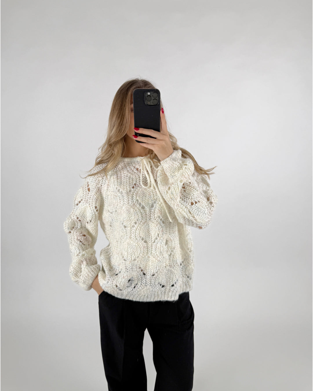 MARGO sticka, vit är en perfekt basic att ha i garderoben. Sticktröjan är långärmad och har de finaste detaljerna. MARGO sticka, vit är designad med en snörning vid kragen.
