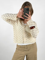 Modellen har V-urringning och stängs fram med stora, matchande knappar som understryker den klassiska designen. Passformen är lätt boxy och avslappnad, vilket gör den superenkel att styla över både toppar, t-shirts och klänningar. Perfekt för vår och sommar – eller som ett varmt lager året runt.
