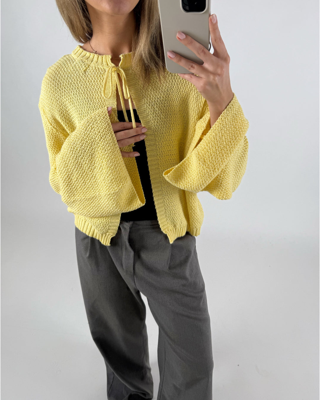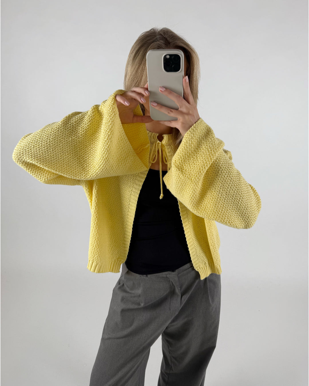 Kvinde iført gul sweater, tager et billede med telefonen. Sweateren har et åbent design med snore i nakken. Hun står foran en neutral, lys baggrund.