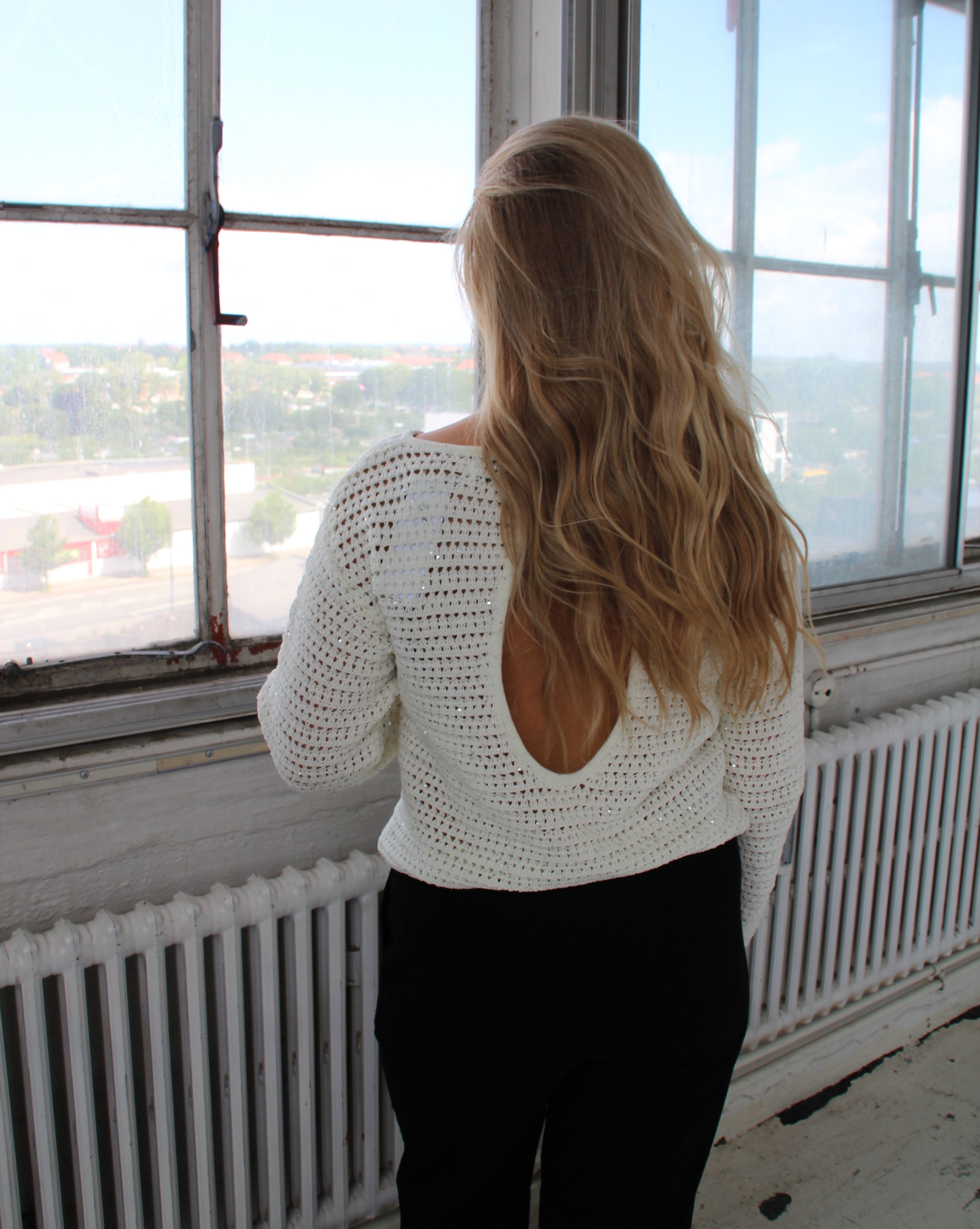 Den vackra SIGRID sticka, vit är en långärmad sticka med fina glitterdetaljer och öppen rygg.