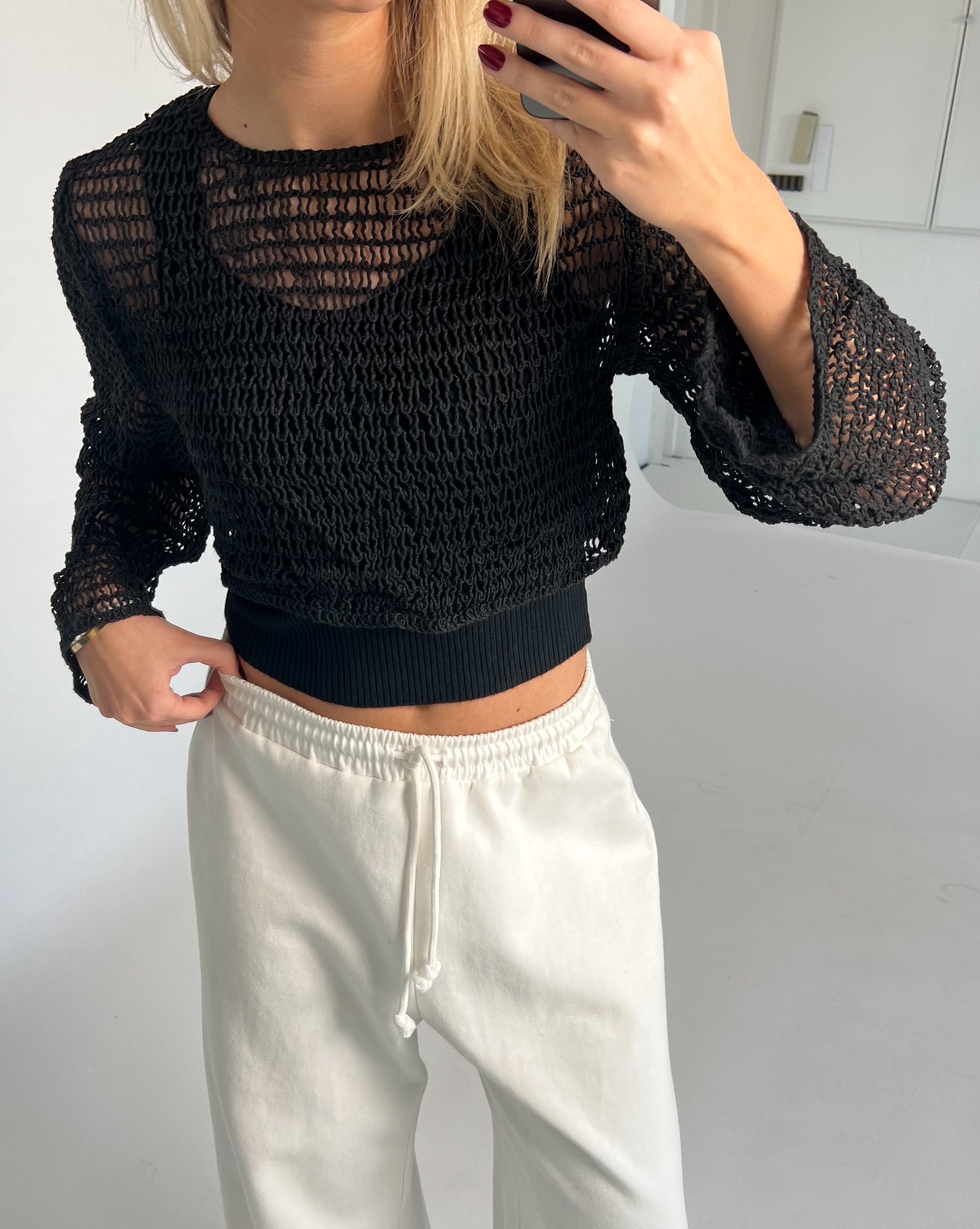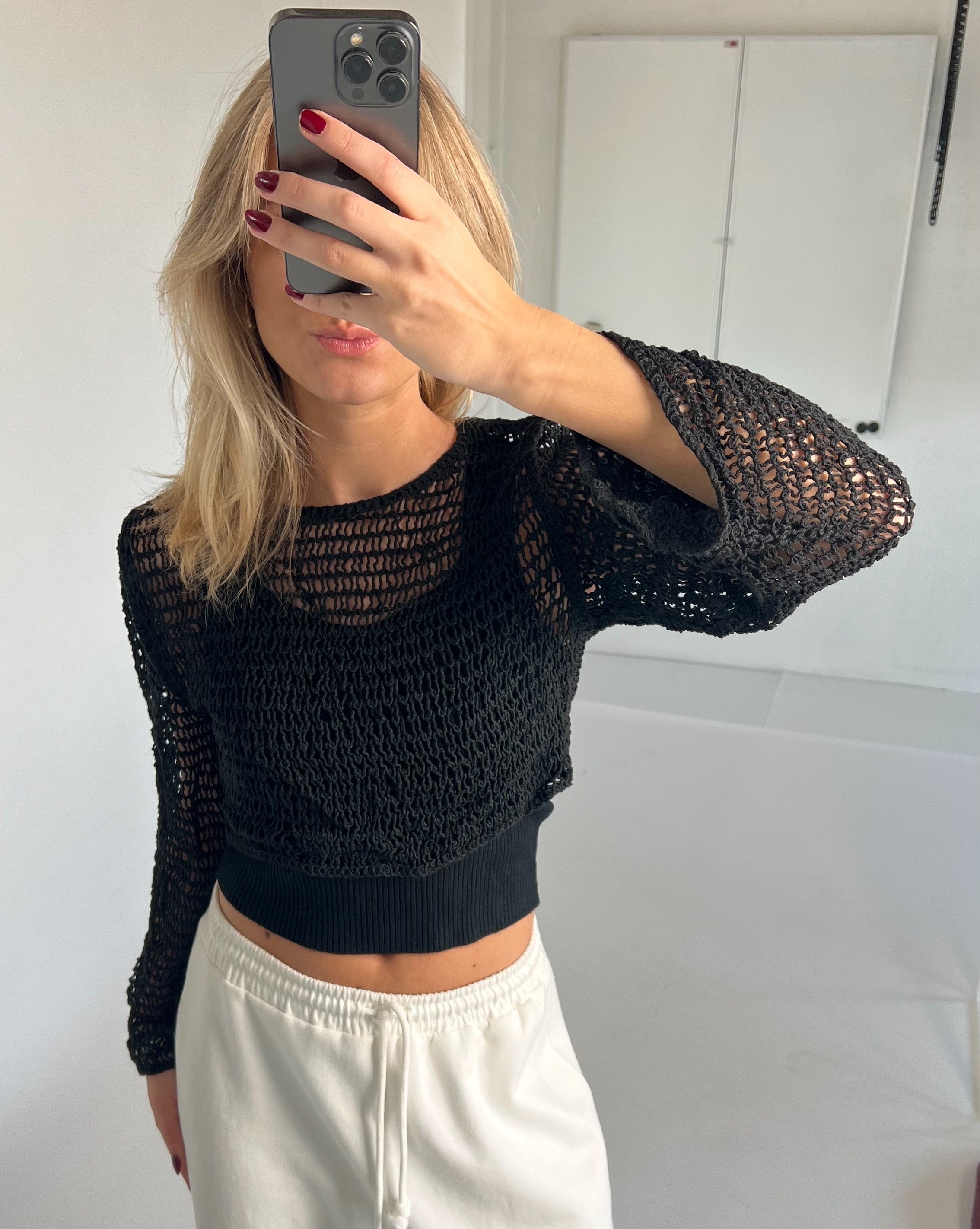 Vår TRINITY sticka, svart är i ett löst stickat material, och är därför genomskinlig. Vi rekommenderar därför att du har en topp eller liknande under.