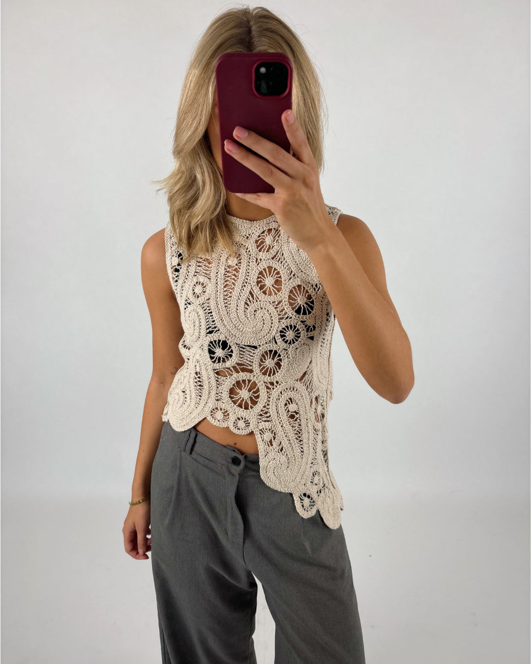 APRIL topp, beige är den vackra sticka toppen i ett virkat utseende. Toppen har ett snedvridet utseende, som är en av dess många vackra detaljer.