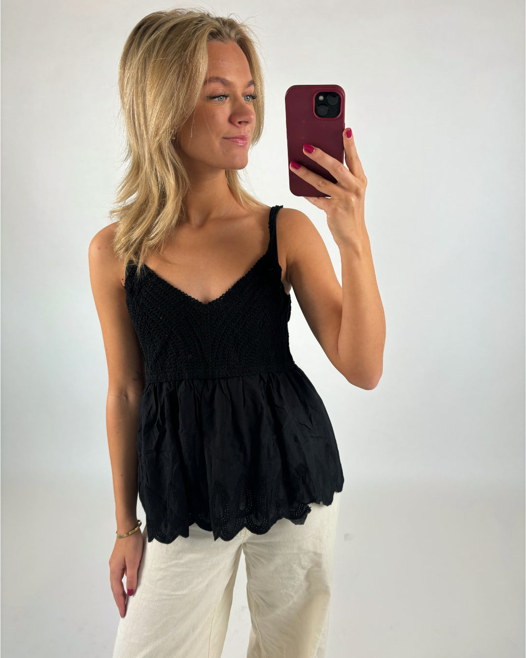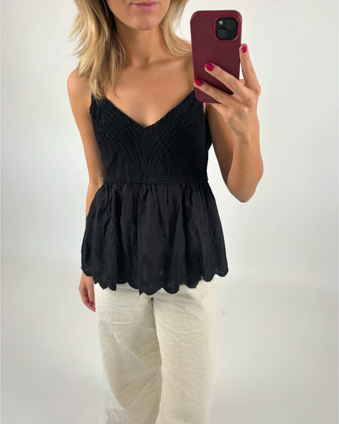 THALIA top, svart har nu landat i shoppen och är perfekt i garderoben. Toppen är basic men har samtidigt vackra detaljer. Toppen har ett virkat utseende upptill och faller ner i ett vackert tyg.