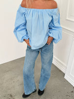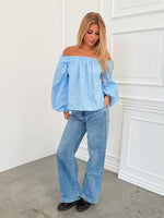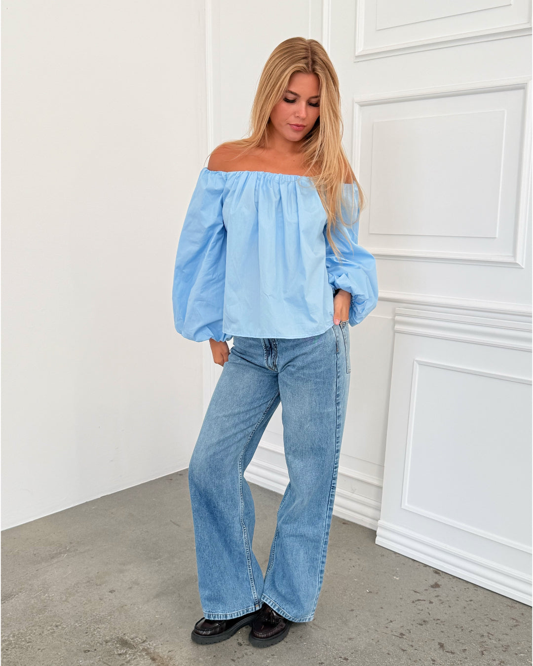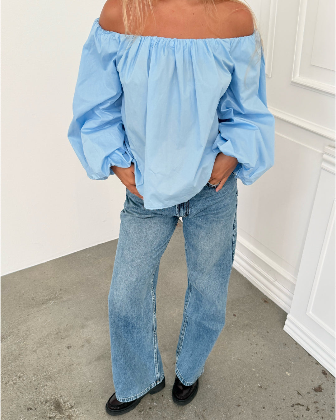 Den vackra ESTELLE off shoulder blusen, blå har nu landat i shoppen. Toppen har ett off shoulder look, med vackra långa ballongärmar.