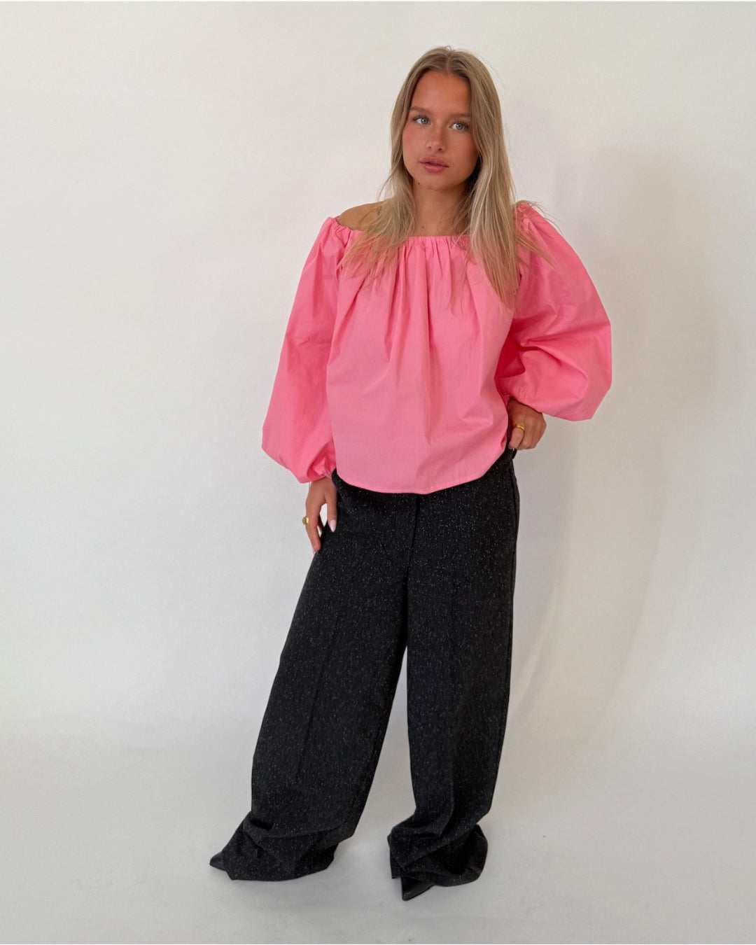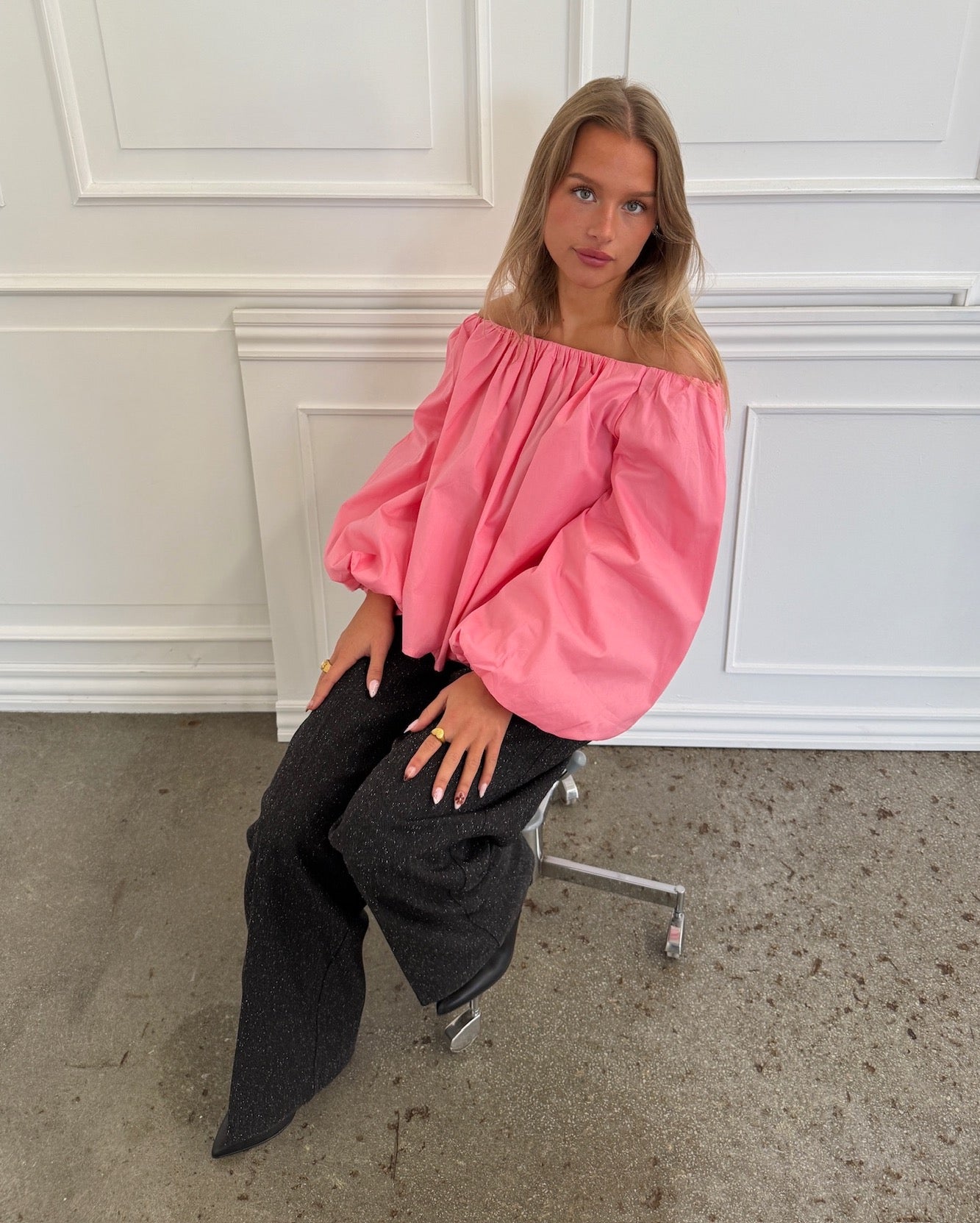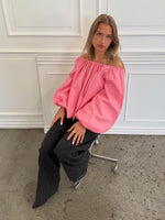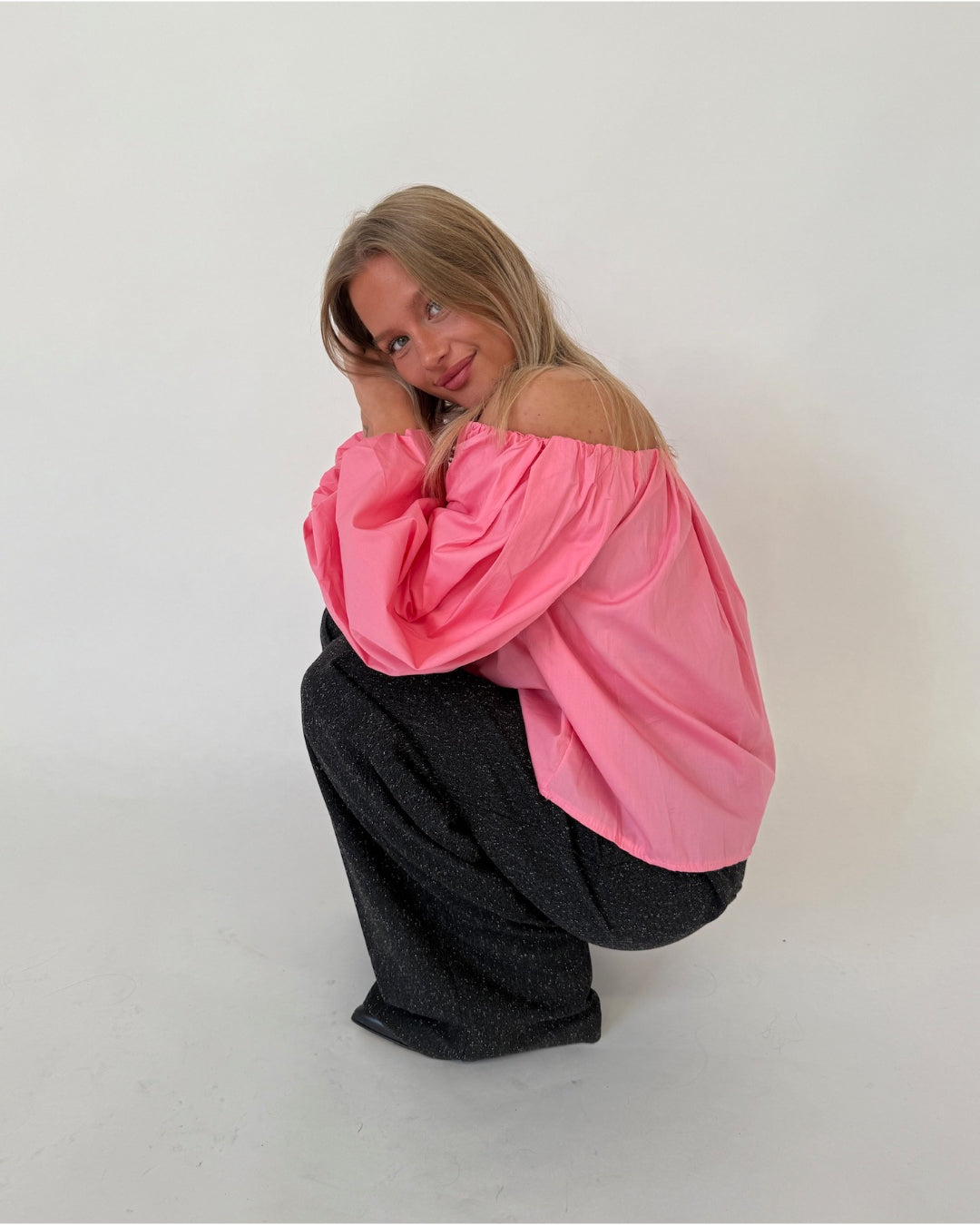 Den vackra ESTELLE off shoulder-blusen, ljusrosa, har nu landat i shoppen. Toppen har ett off shoulder-look, med vackra långa ballongärmar.