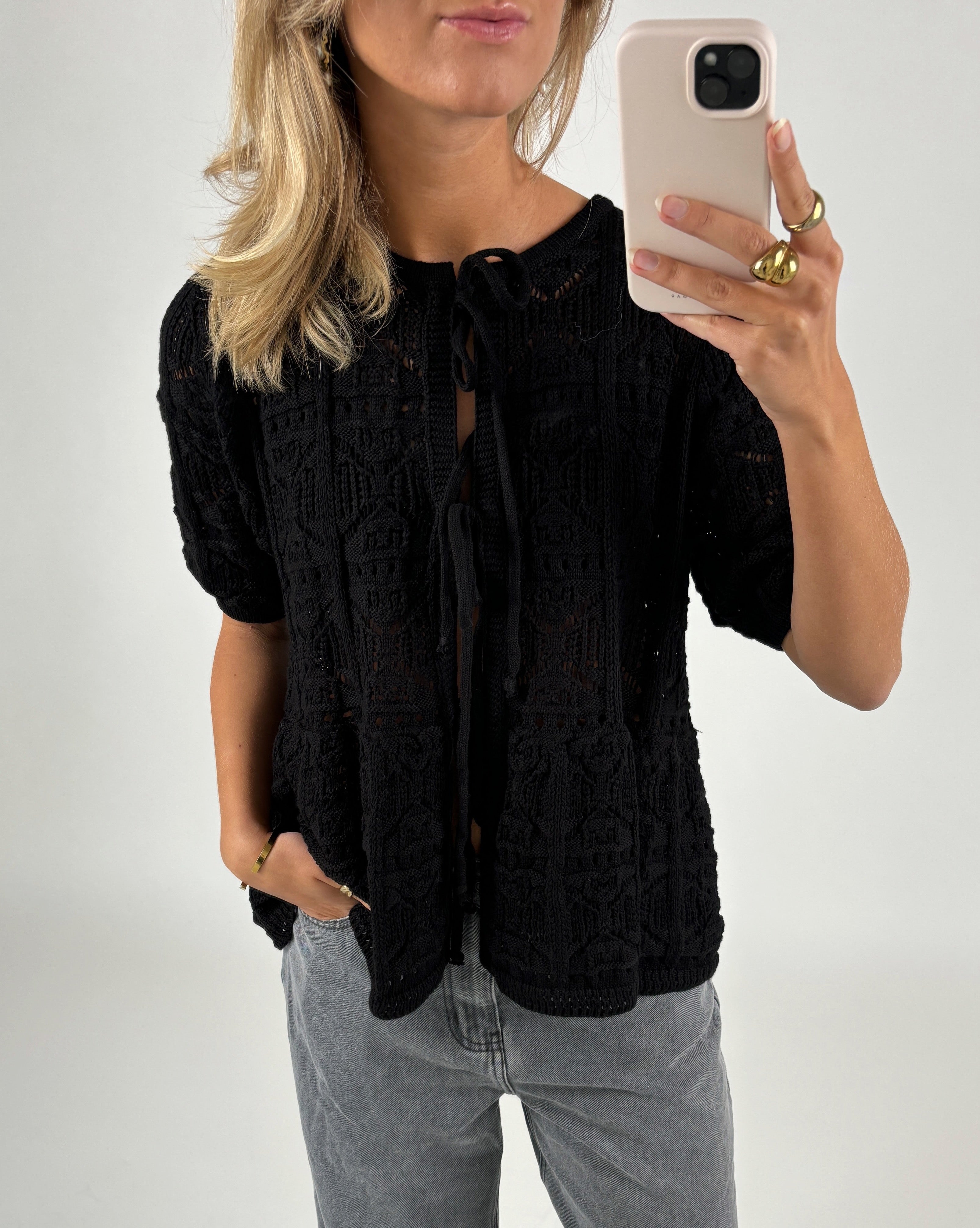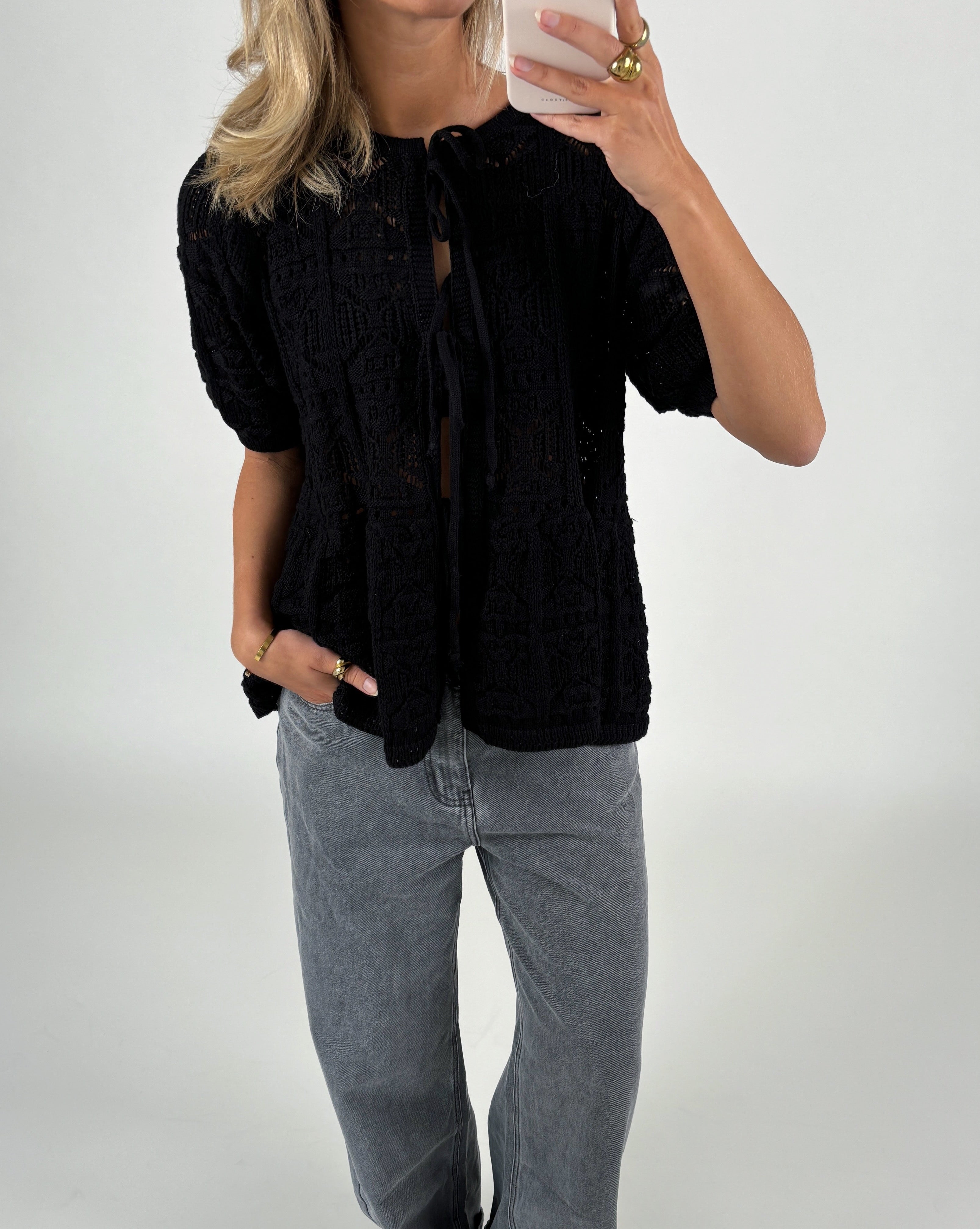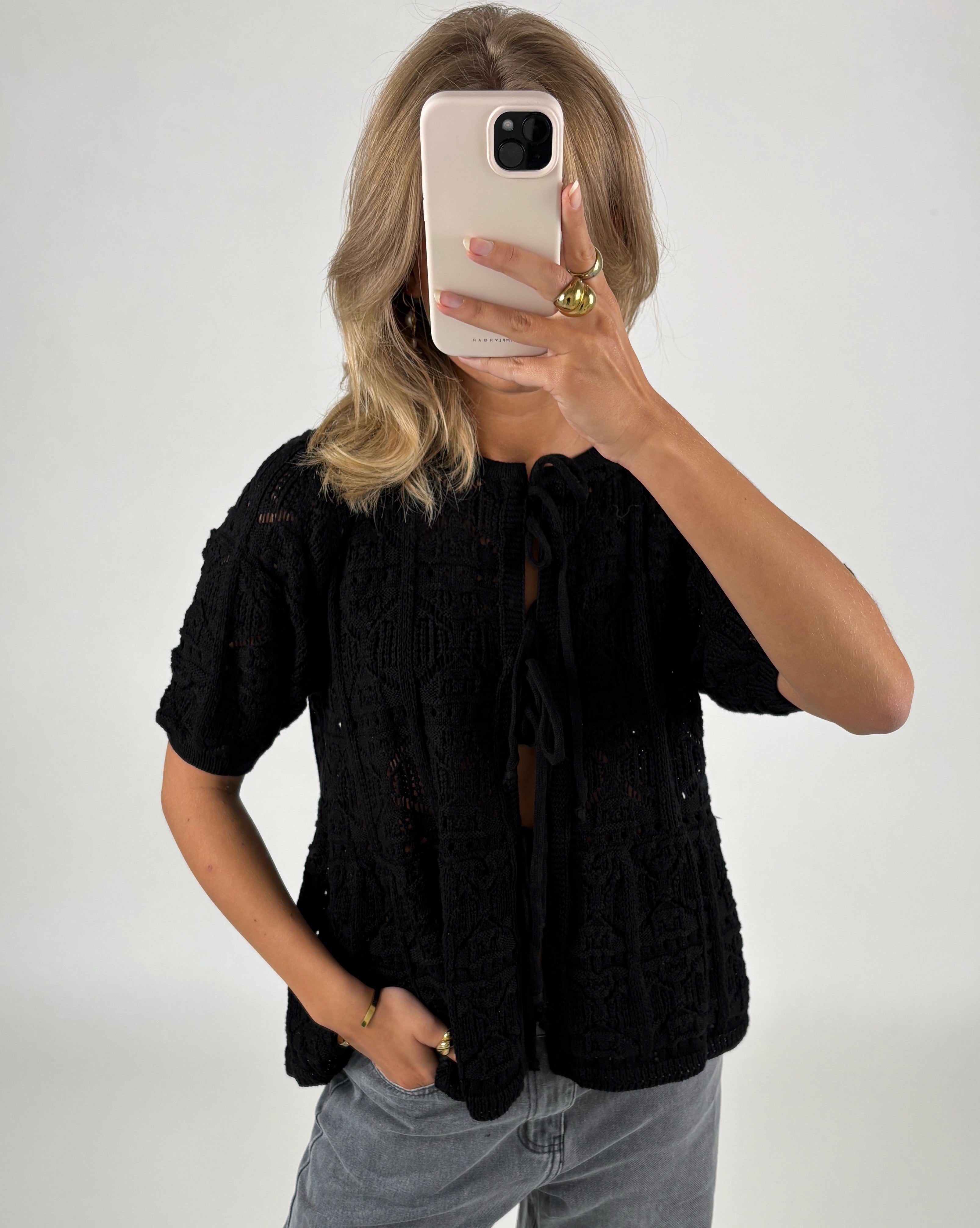Den vackra MYNTE sticka, svart är en vacker sticka med virkat uttryck. Stickan är kortärmad och stängs med hjälp av bindebandet fram, som kan knytas till 3 söta rosetter.