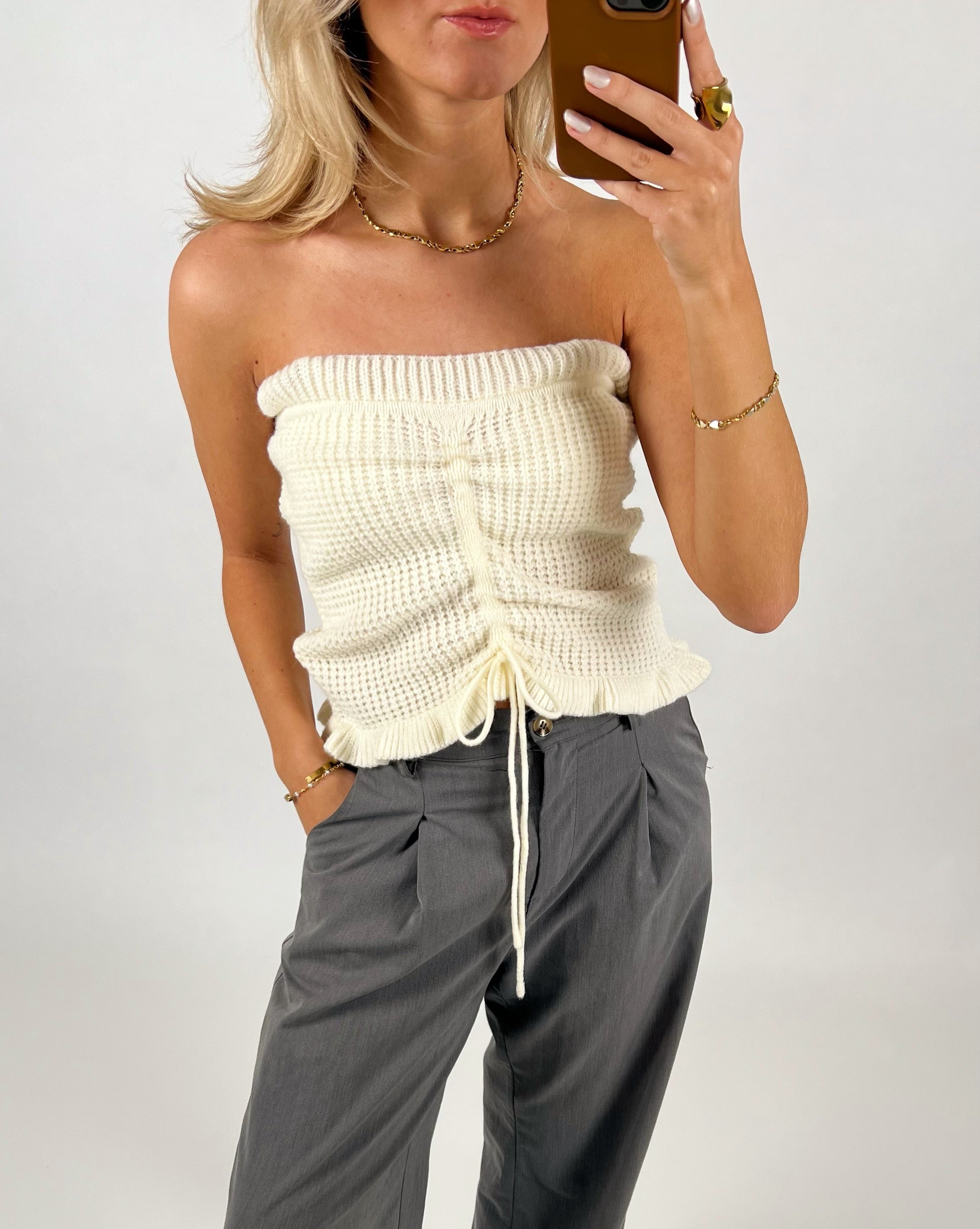 Den vackra TINA stickade toppen, creme är en axelbandslös stickad topp som är en aning genomskinlig.
