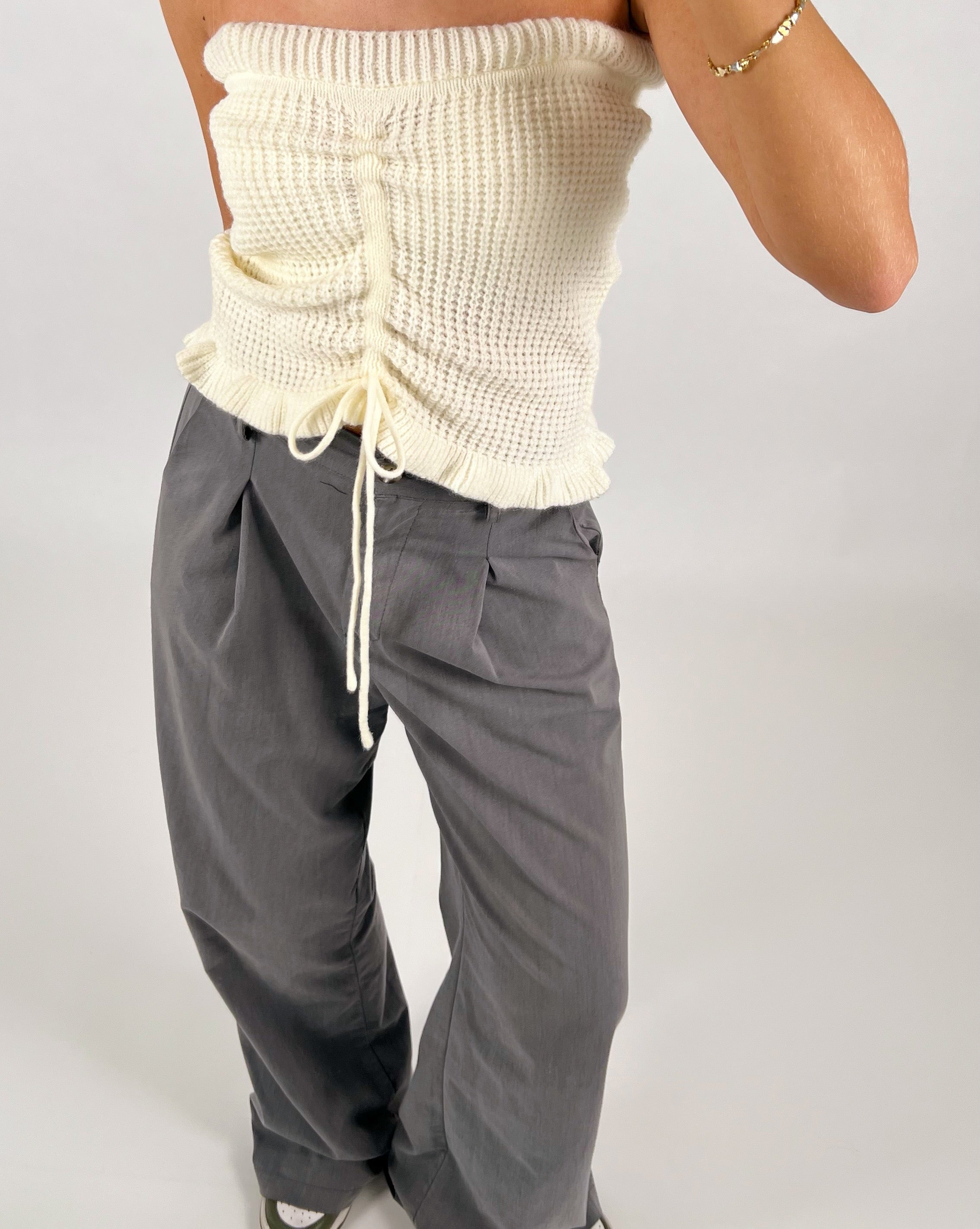En person iført en cremefarvet, strikket top med snøre foran, hviler en arm på hoften. De har mørkegrå bukser på, stående mod en lys baggrund.